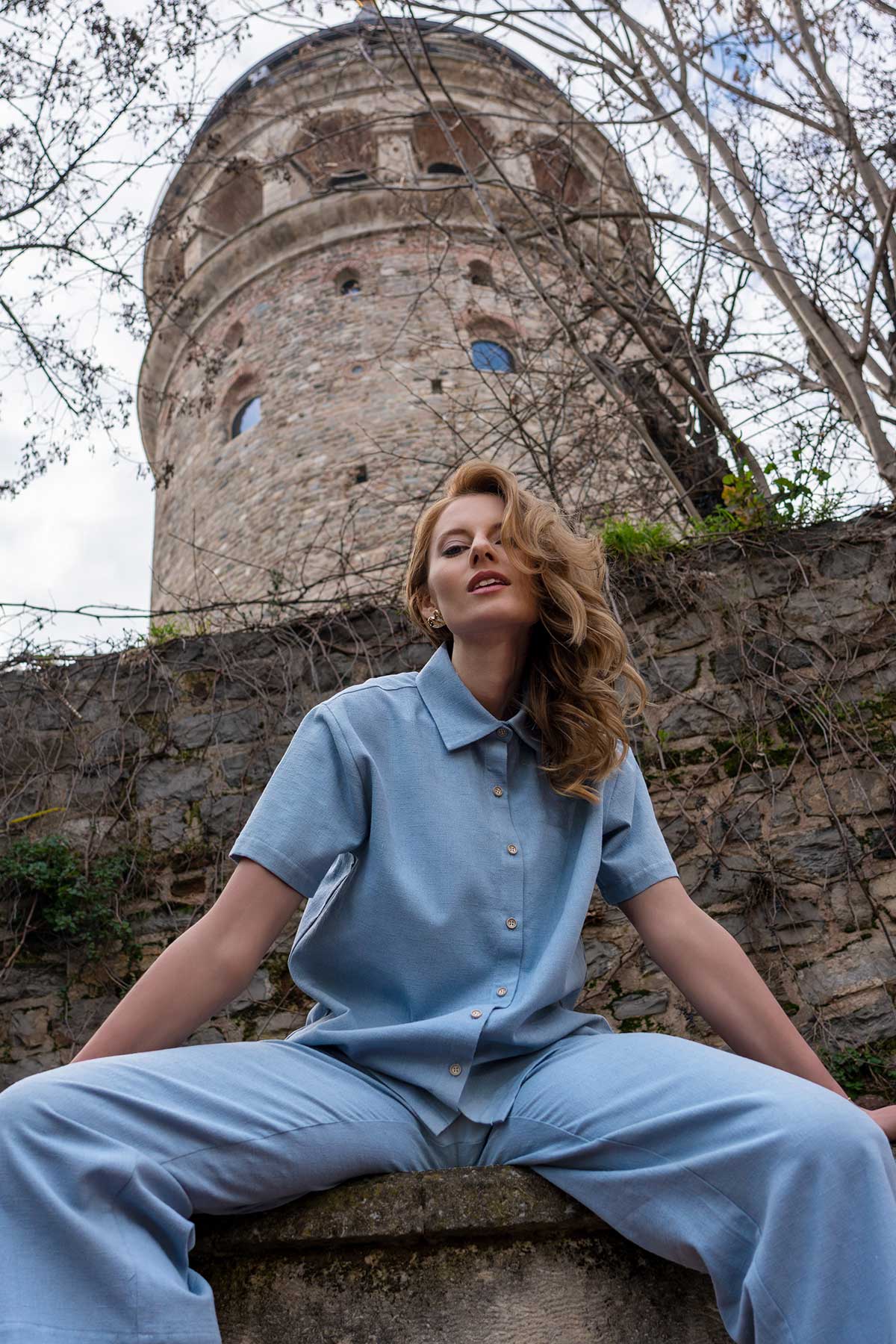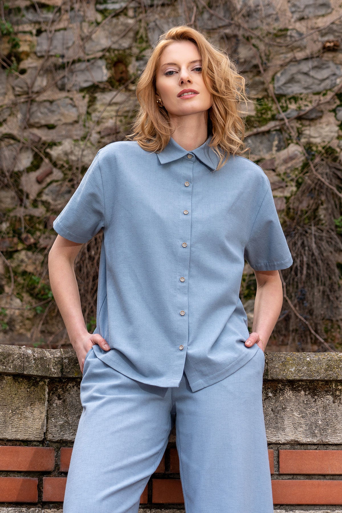 KADIN PAMUK KISA KOL GOMLEK BILEK BOY CEPLI PANTOLON TAKIM