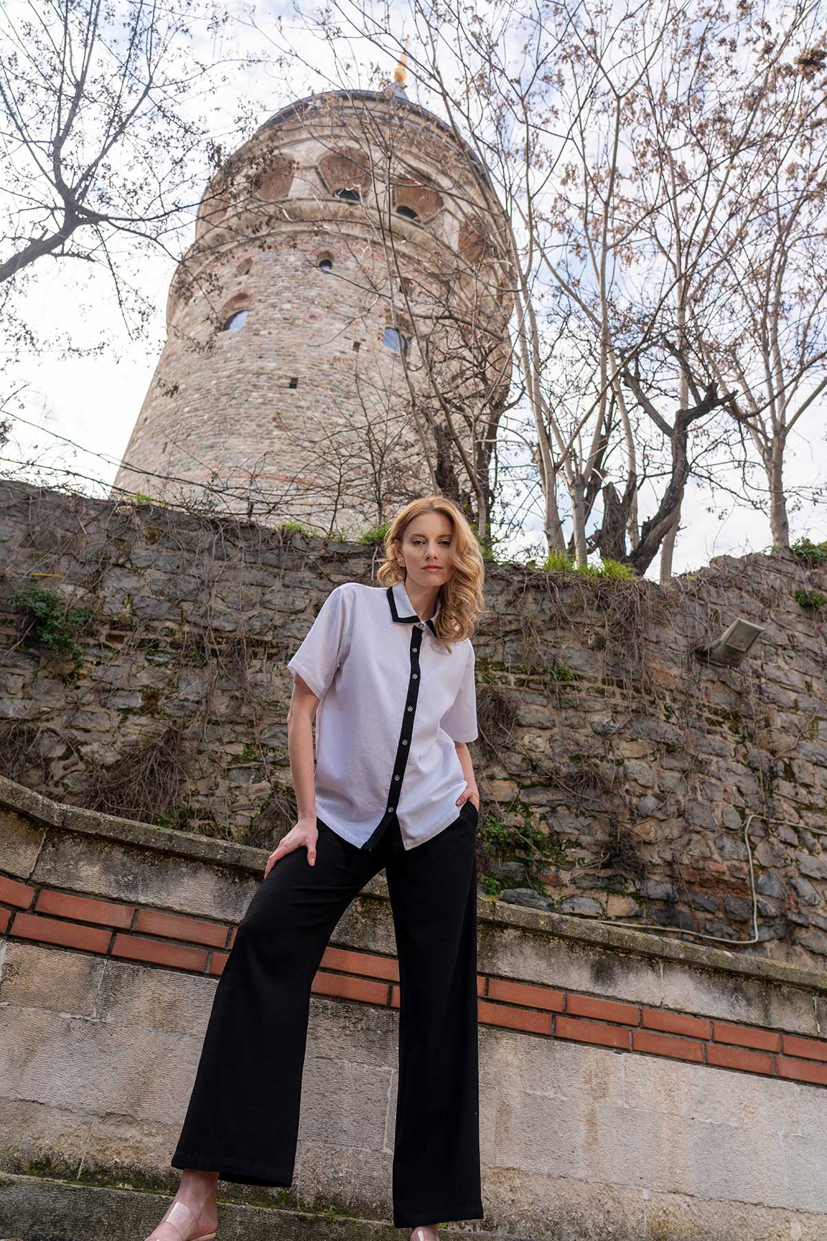 KADIN PAMUK YAKA UCU VE PATI SIYAH GARNILI KISA KOL GOMLEK CEPLI PANTOLON TAKIM