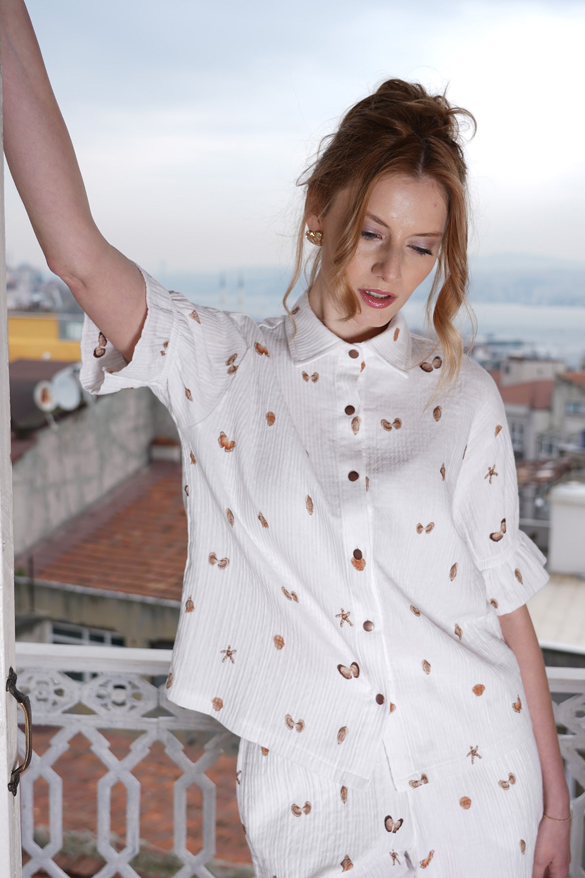 KADIN MUSLIN KOLUCU FIRFIRLI GOMLEK LASTIKLI CEPLI SORT TAKIM