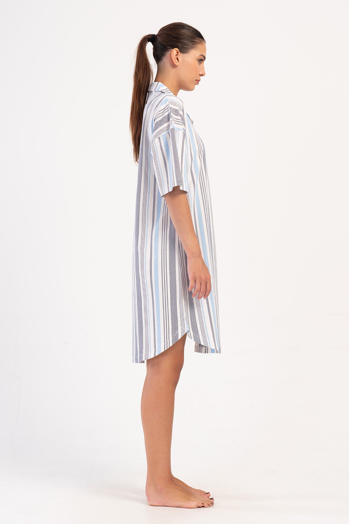Woman Light Blue Supreme Shirt Neck Narrow Leg Buttoned Short Sleeve Shirt Tunic