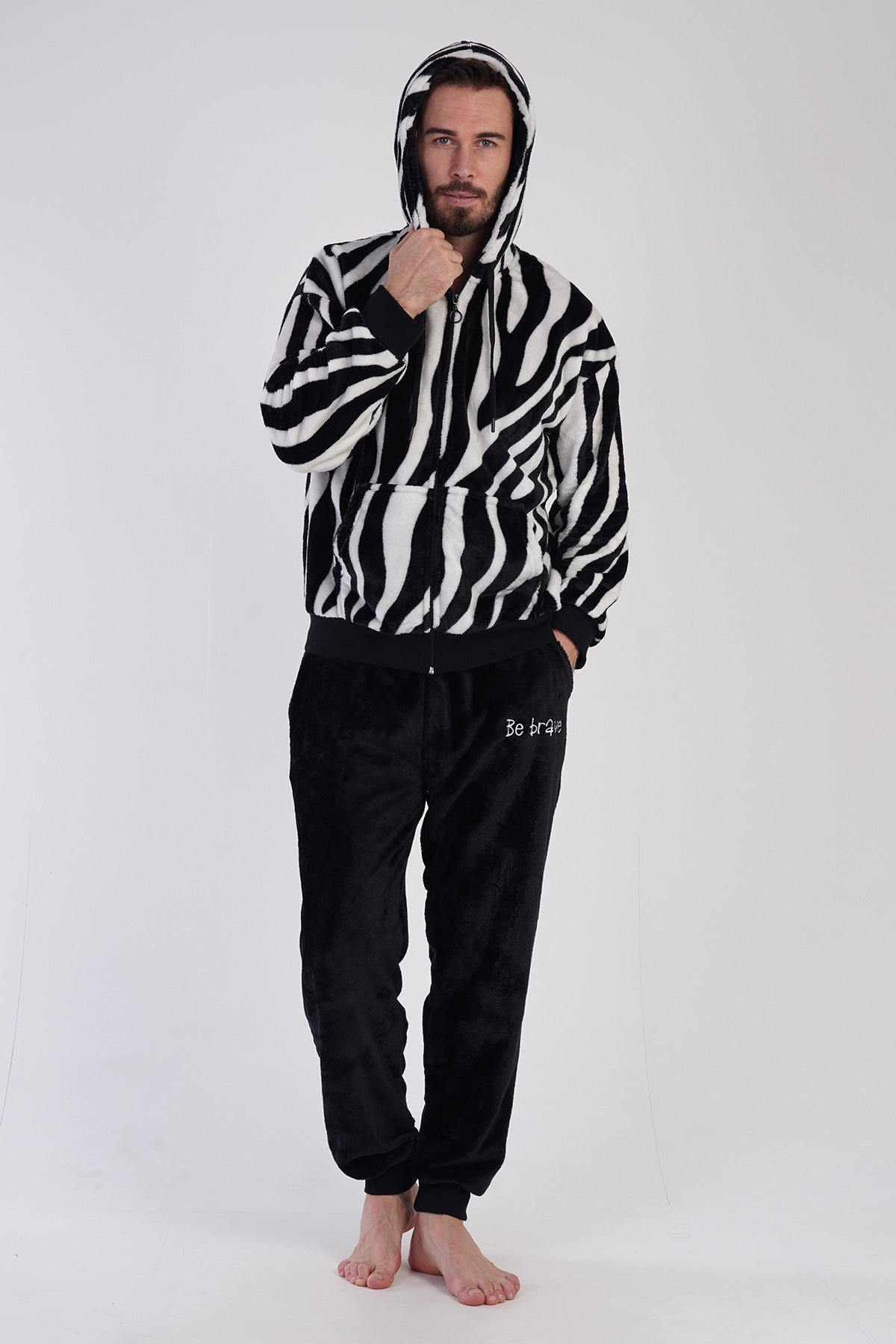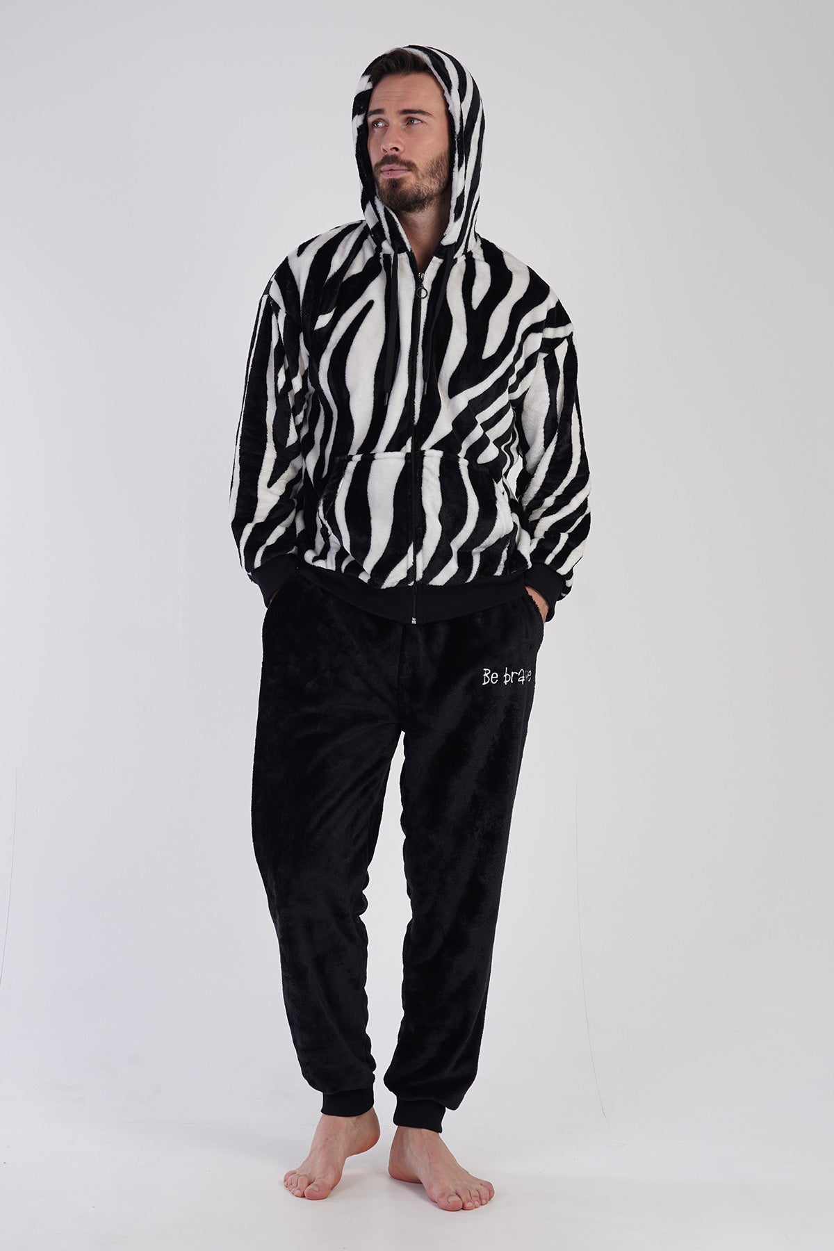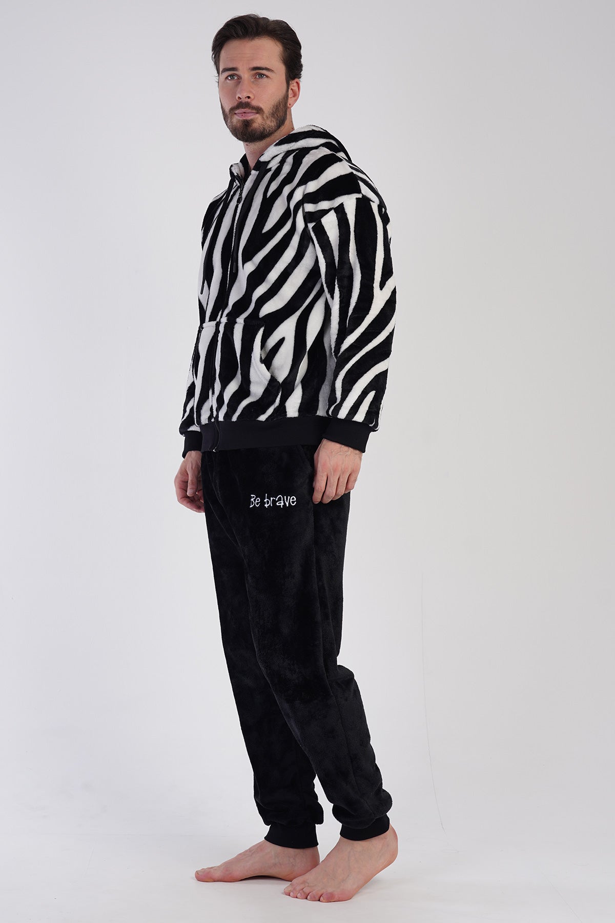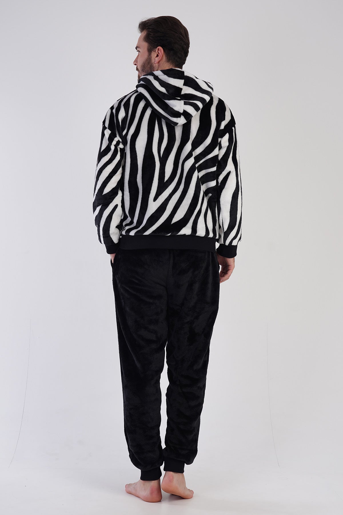 Man Fleece Soft Hoodie and Pocket Detail Low Shoulder Zipper Detail Zebra Pyjama Set