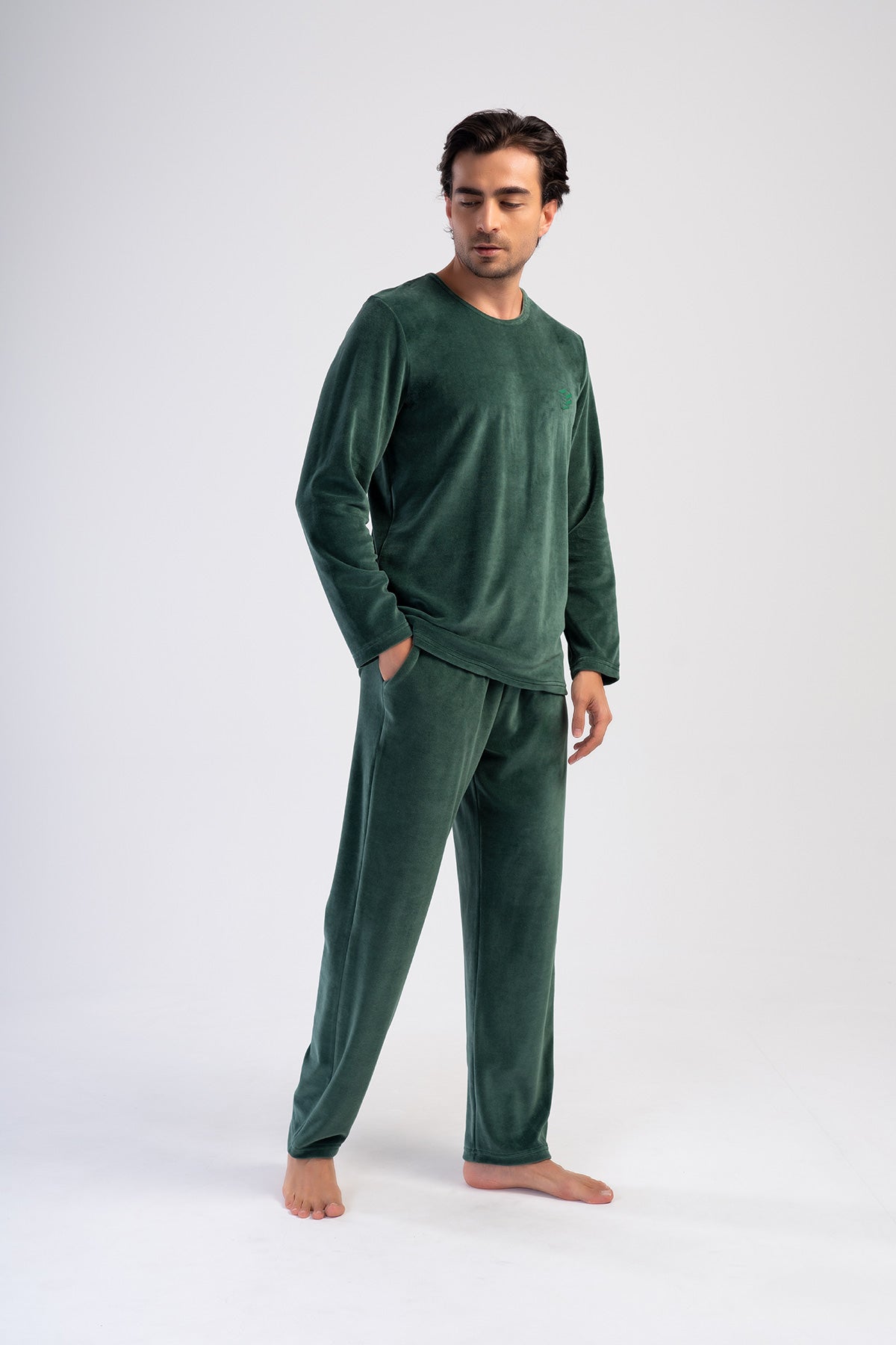 Man Velvet Silver Pıne O Neck Long Sleeve Pocket Detail Pyjama Set