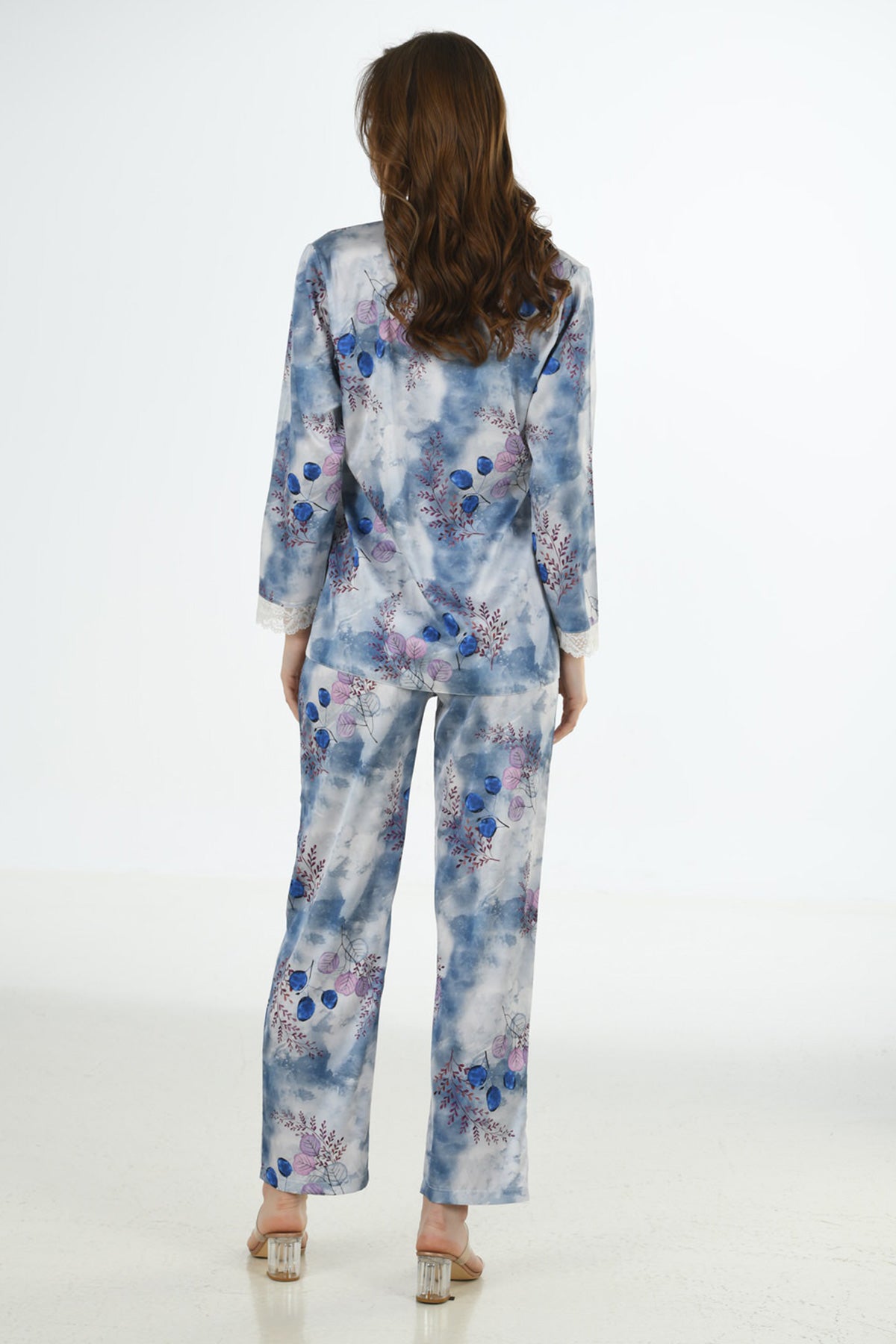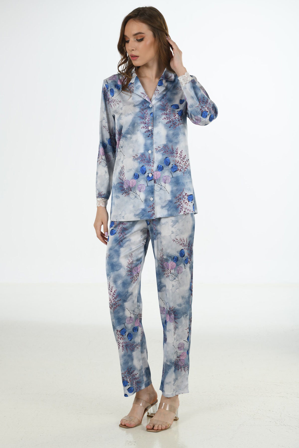 Woman Satin Buttoned Long Sleeve Ocean Pyjama Set