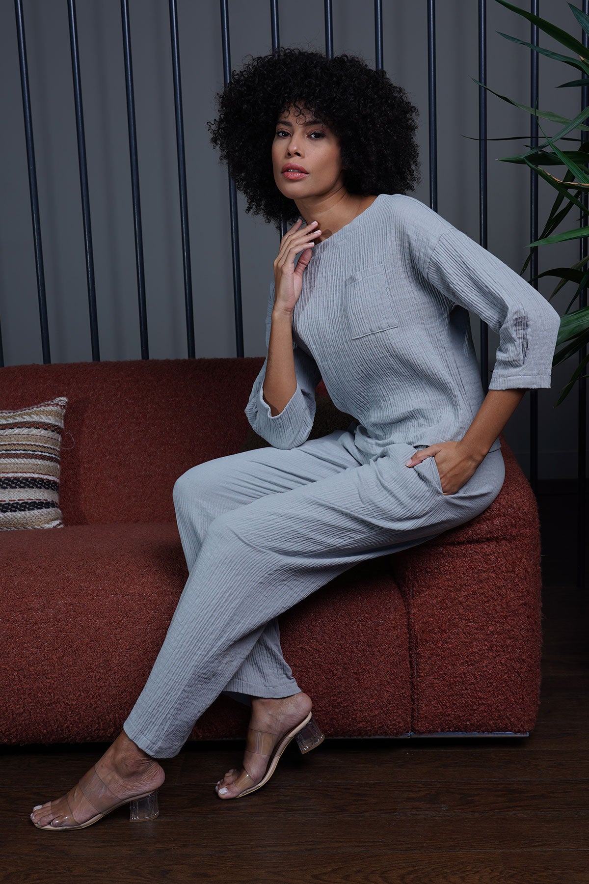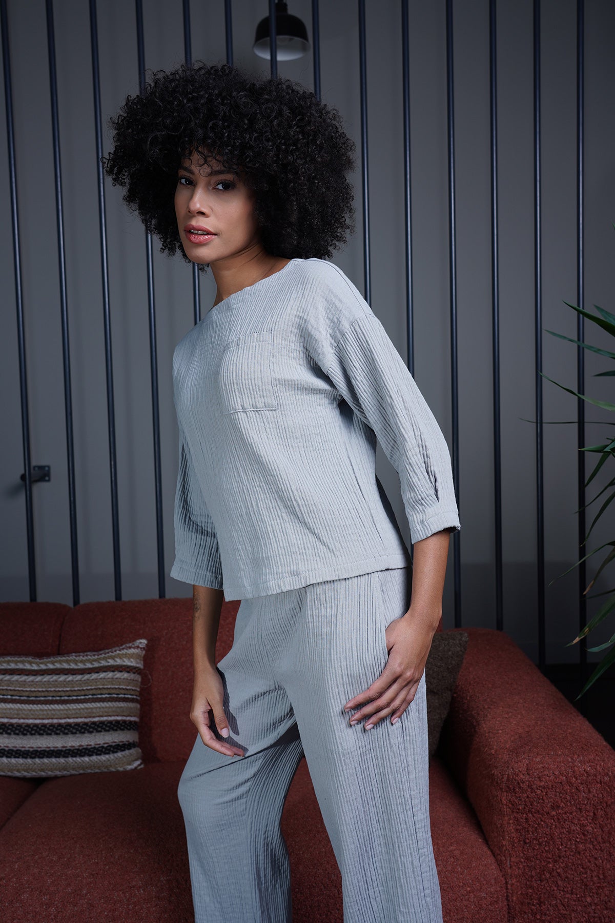 KADIN MUSLIN KAYIK YAKA DUSUK OMUZ KOL ORTASI PILILI SALAS BLUZ PANTOLON TAKIM