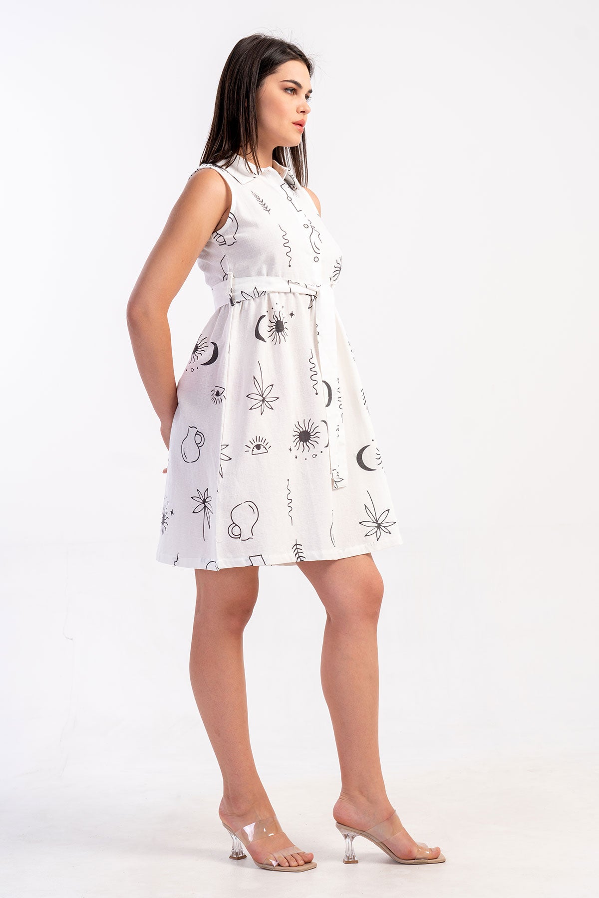 KADIN KIBRIS KOLSUZ BELE KADAR DUGMELI YAKA AYAKSIZ KEMERLI ELBISE