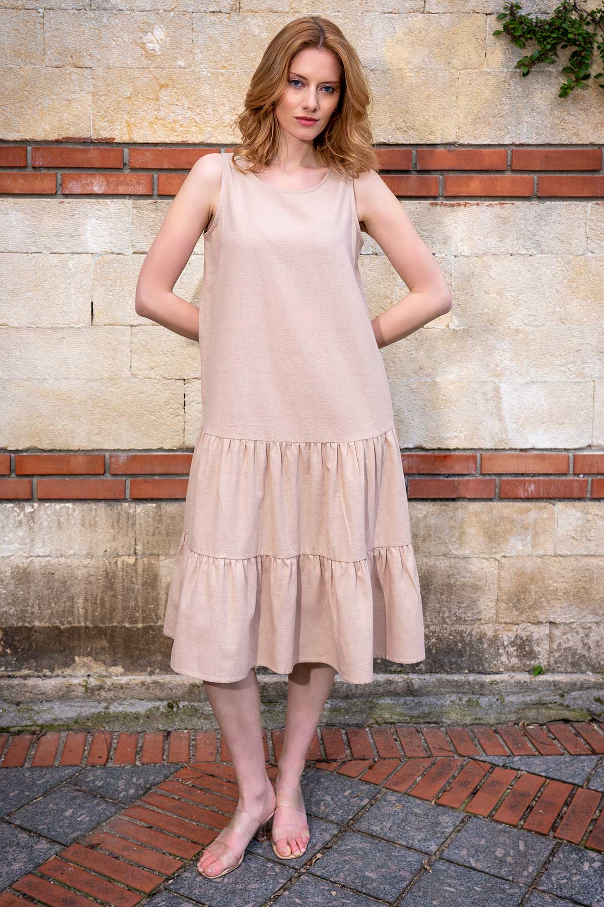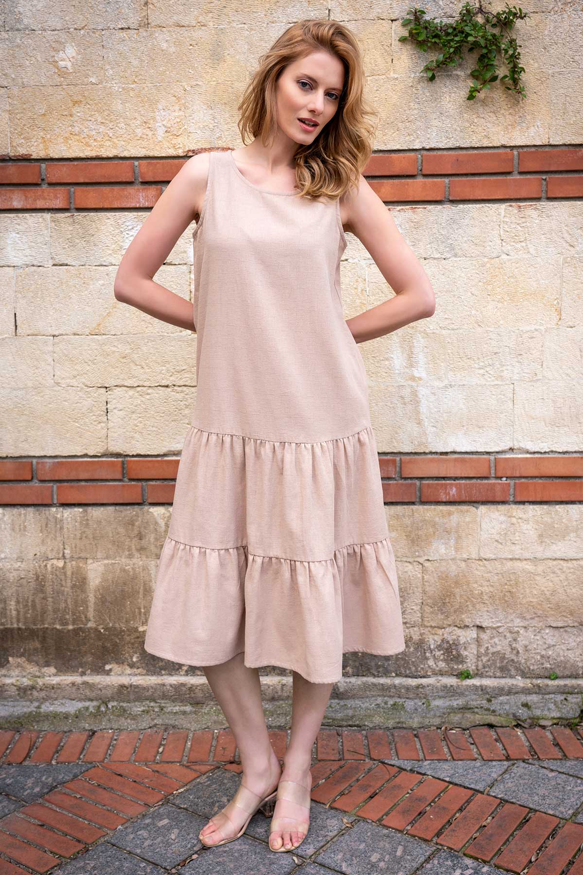 KADIN PAMUK KOLSUZ BISIKLET YAKA ETEGI CIFT KAT FIRFIRLI ELBISE