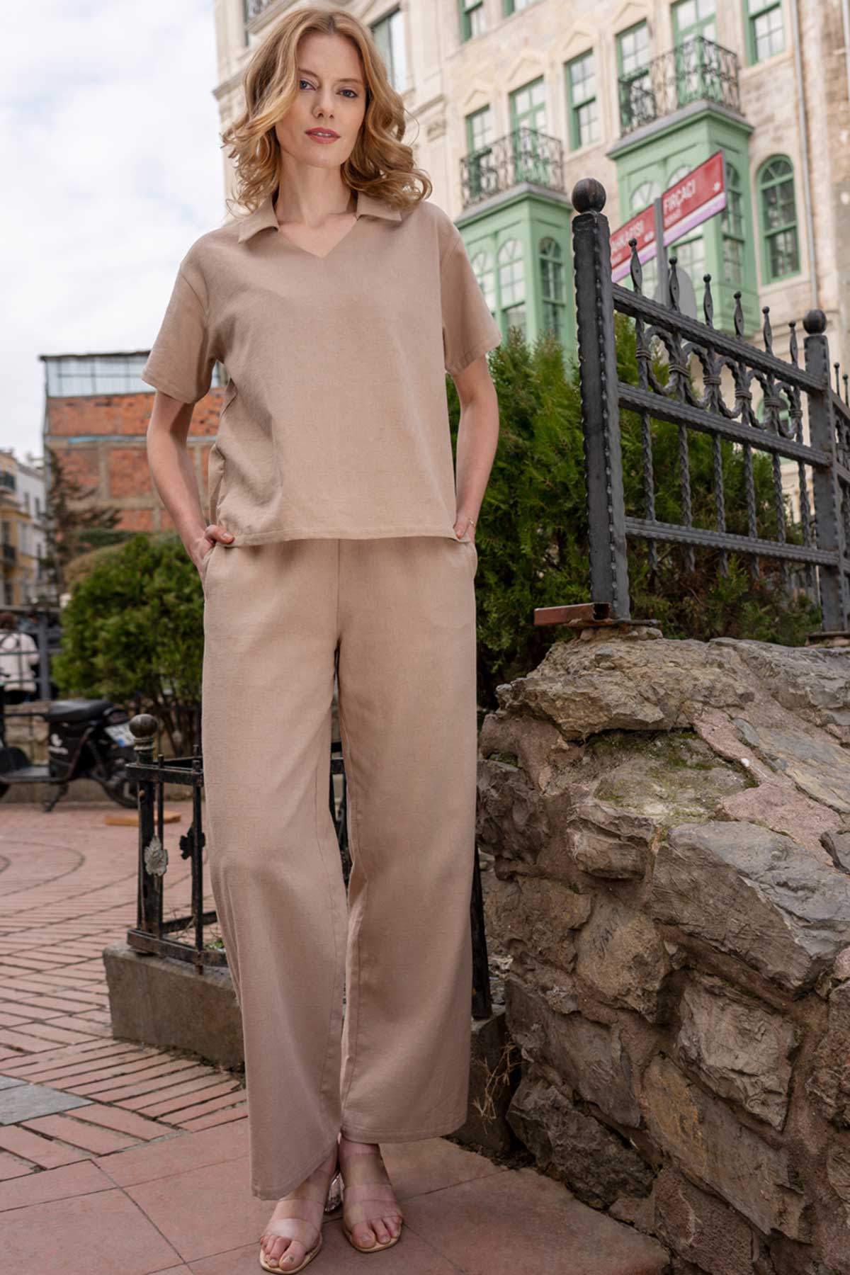 KADIN PAMUK YAKA AYAKSIZ V DETAYLI GOMLEK YAKA BLUZ CEPLI PANTOLON TAKIM