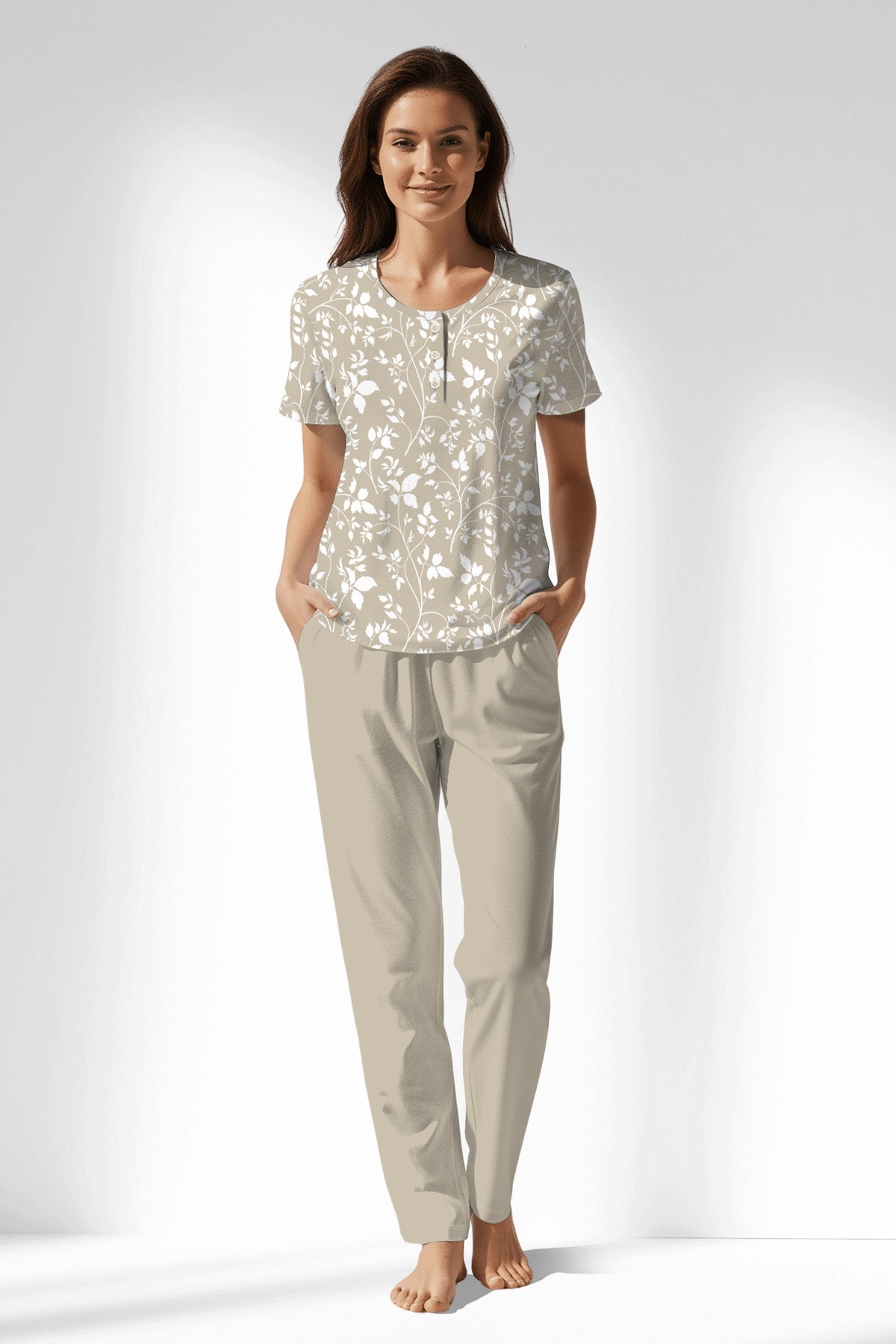 Woman Polyviscon Sprig Buttoned Collar Short Sleeve Pyjama Set