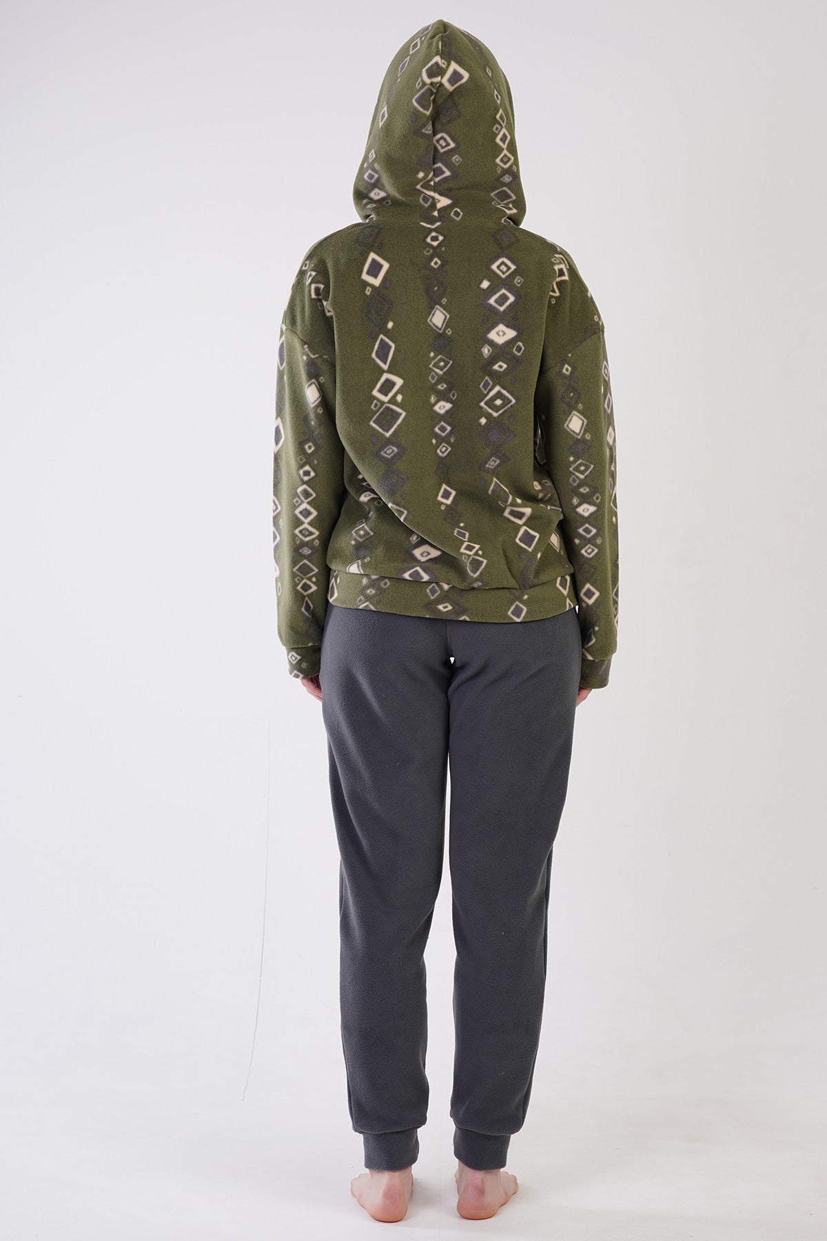 WOMEN'S FLEECE HOODED, DROPPED-SHOULDER, ZIP-UP, LONG-SLEEVE PAJAMA SET WITH CUFFS AND POCKETS.