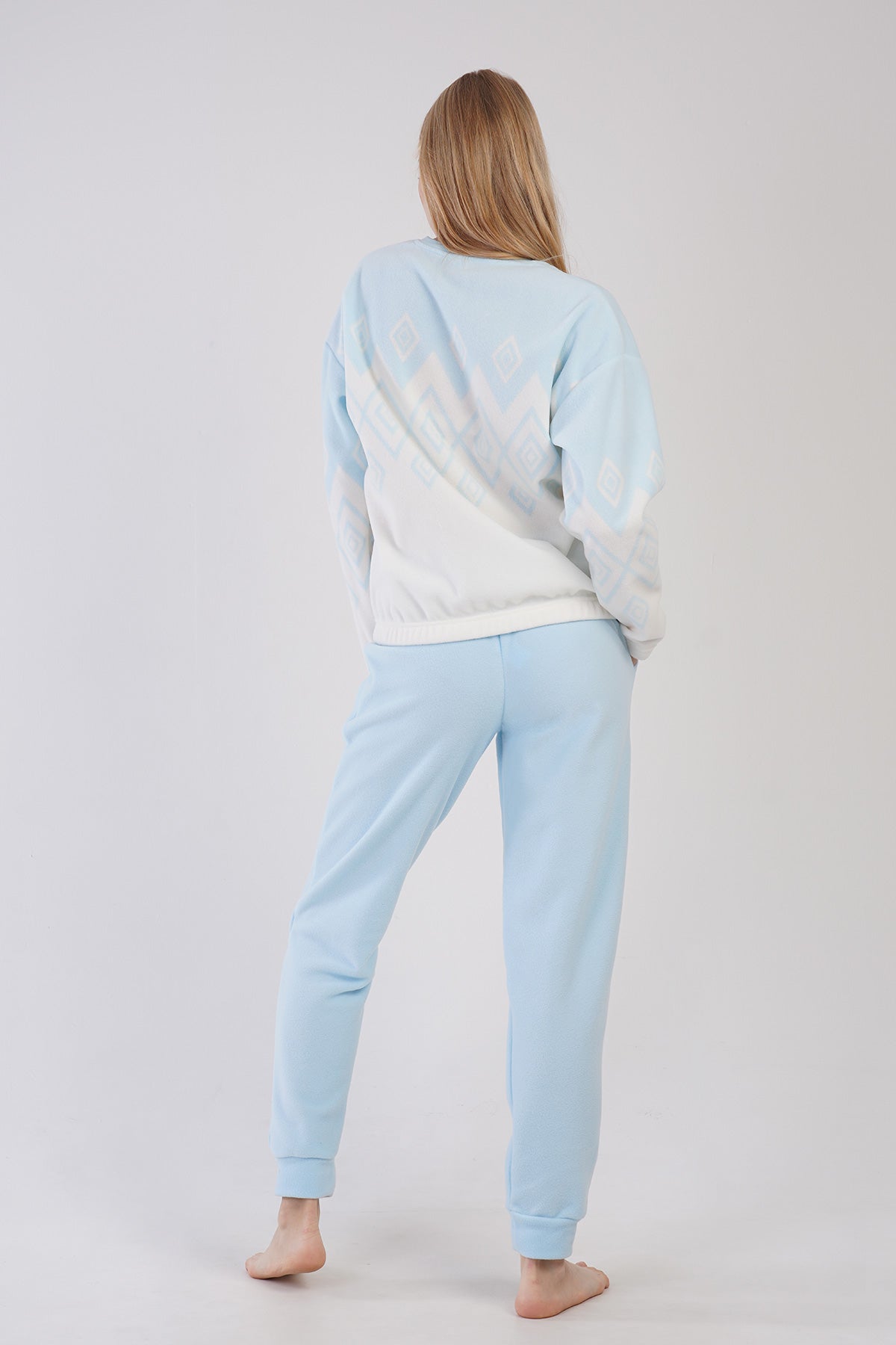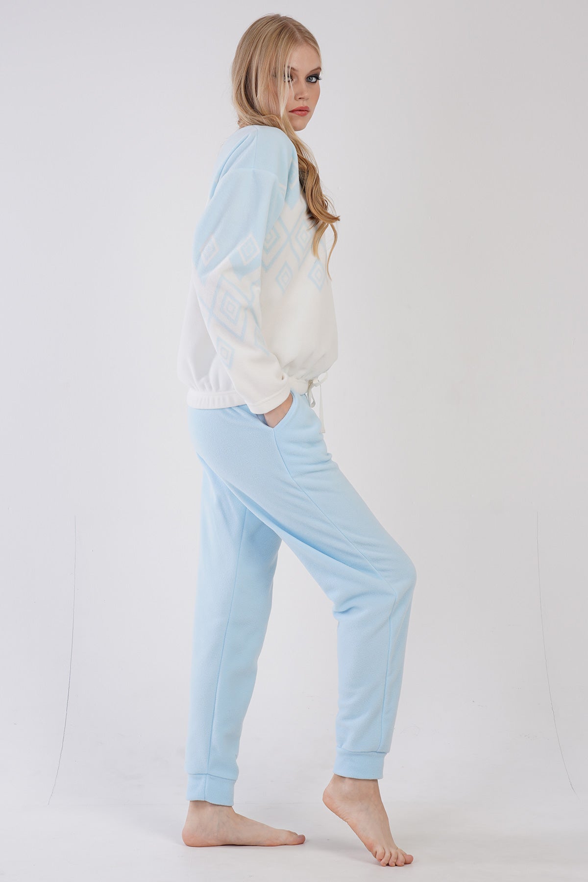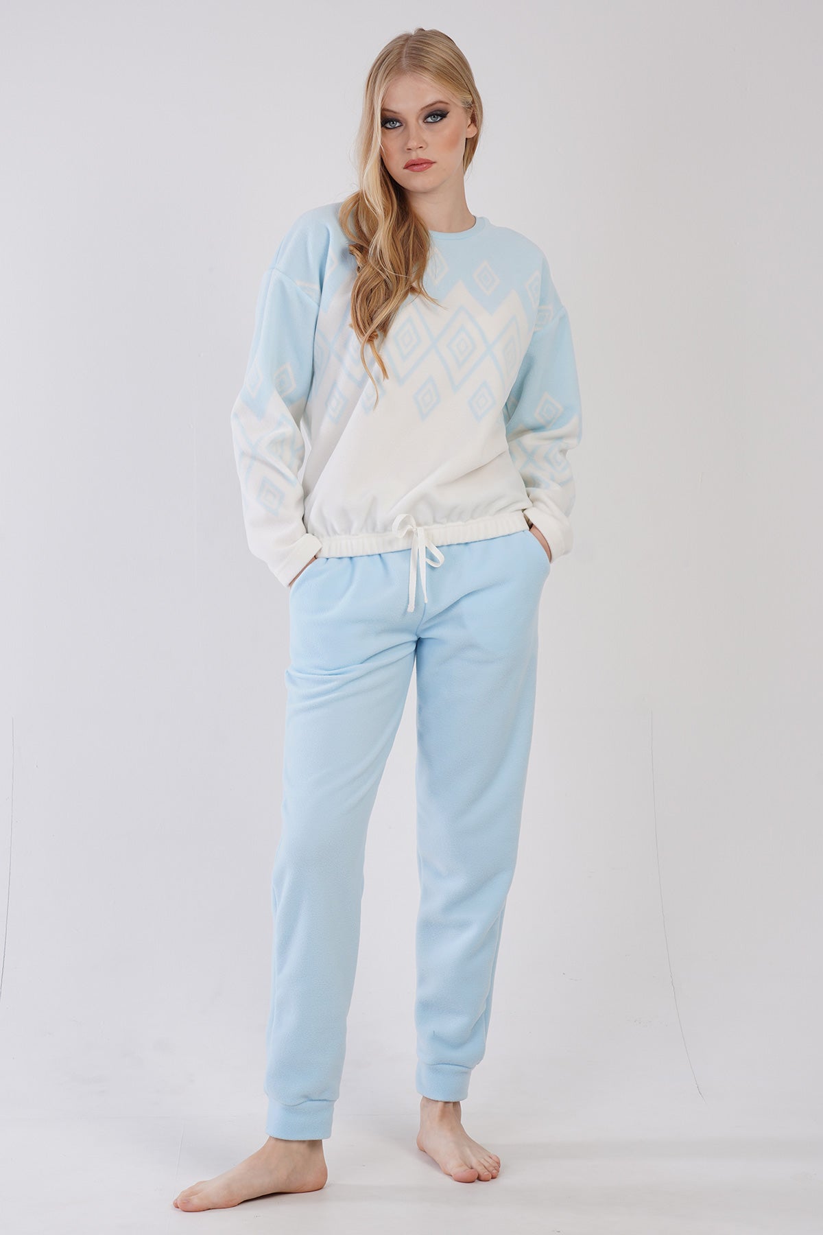 WOMEN'S FLEECE COLLAR, OFF-SHOULDER, LONG-SLEEVE PAJAMA SET WITH GATHERED WAIST AND CUFFED POCKETS.