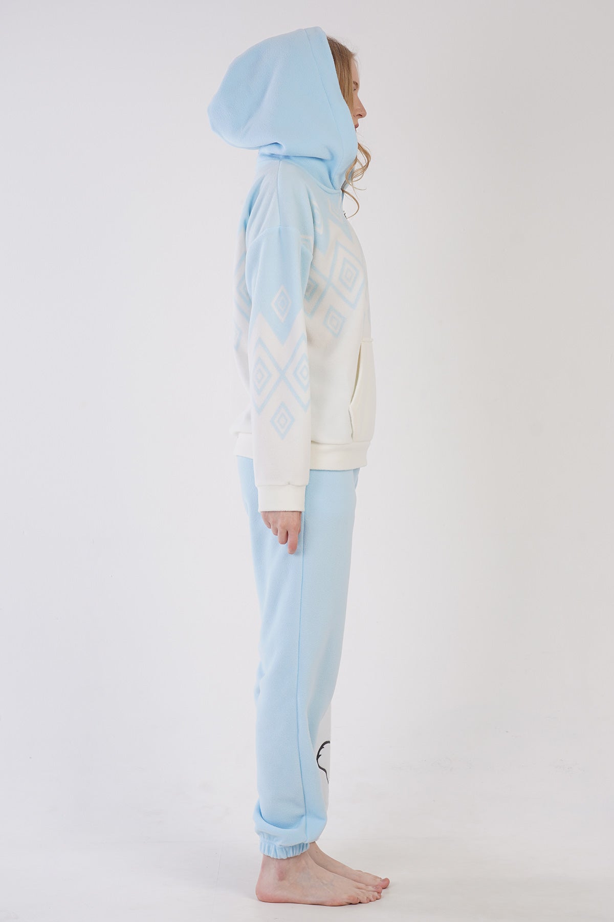 WOMEN'S FLEECE HOODED, DROPPED-SHOULDER, HALF-ZIP, LONG-SLEEVE PAJAMA SET WITH KANGAROO POCKETS AND CUFFED POCKETS.