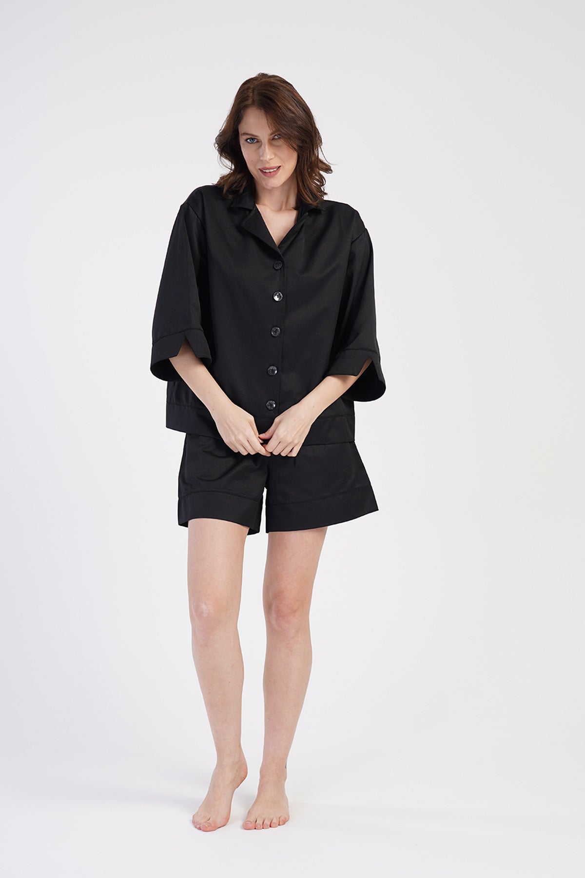 WOMEN'S OXFORD SHIRT WITH FULL BUTTON COLLAR, 7/8 SLEEVE, AND POCKETED SHORTS SET.