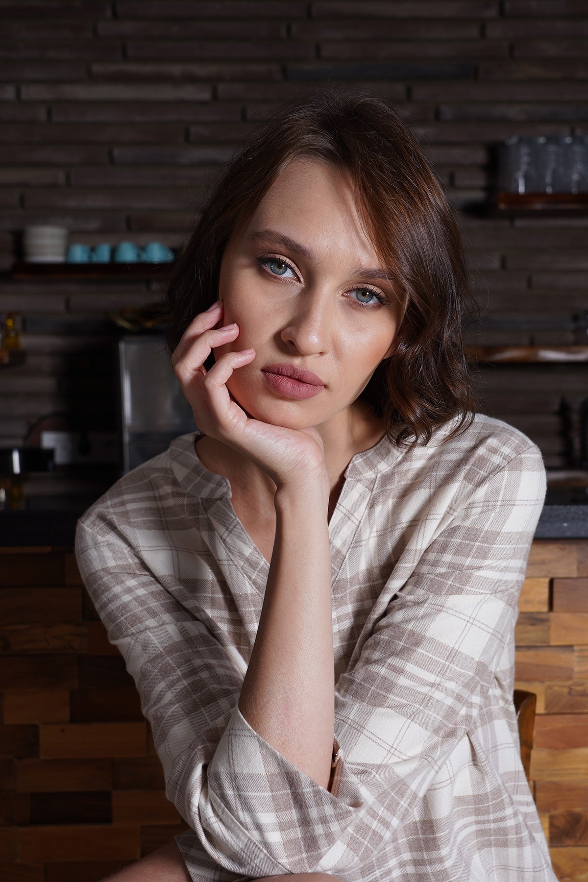 WOMEN'S WOVEN DRESS WITH STANDARD COLLAR, HALF-PLASTER, 7/8 SLEEVE, AND CUFFS.