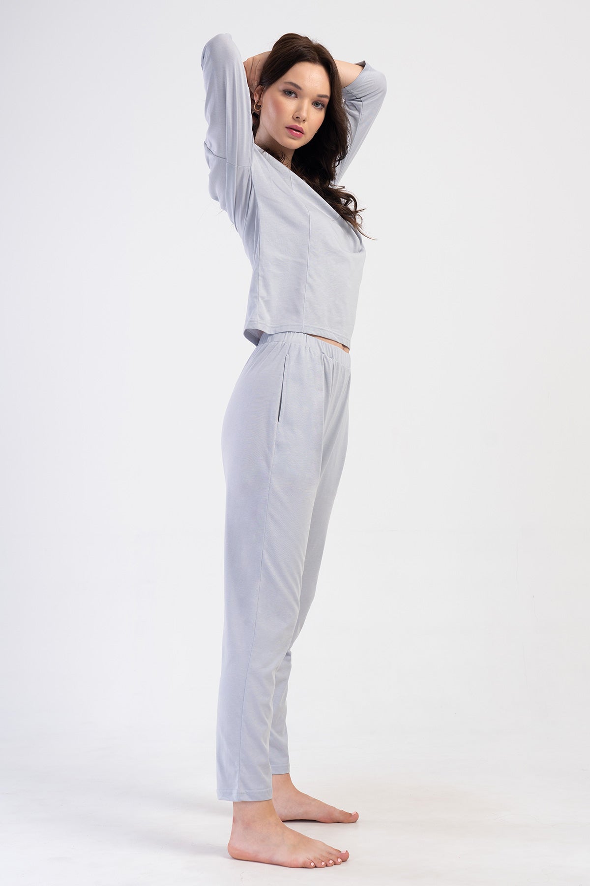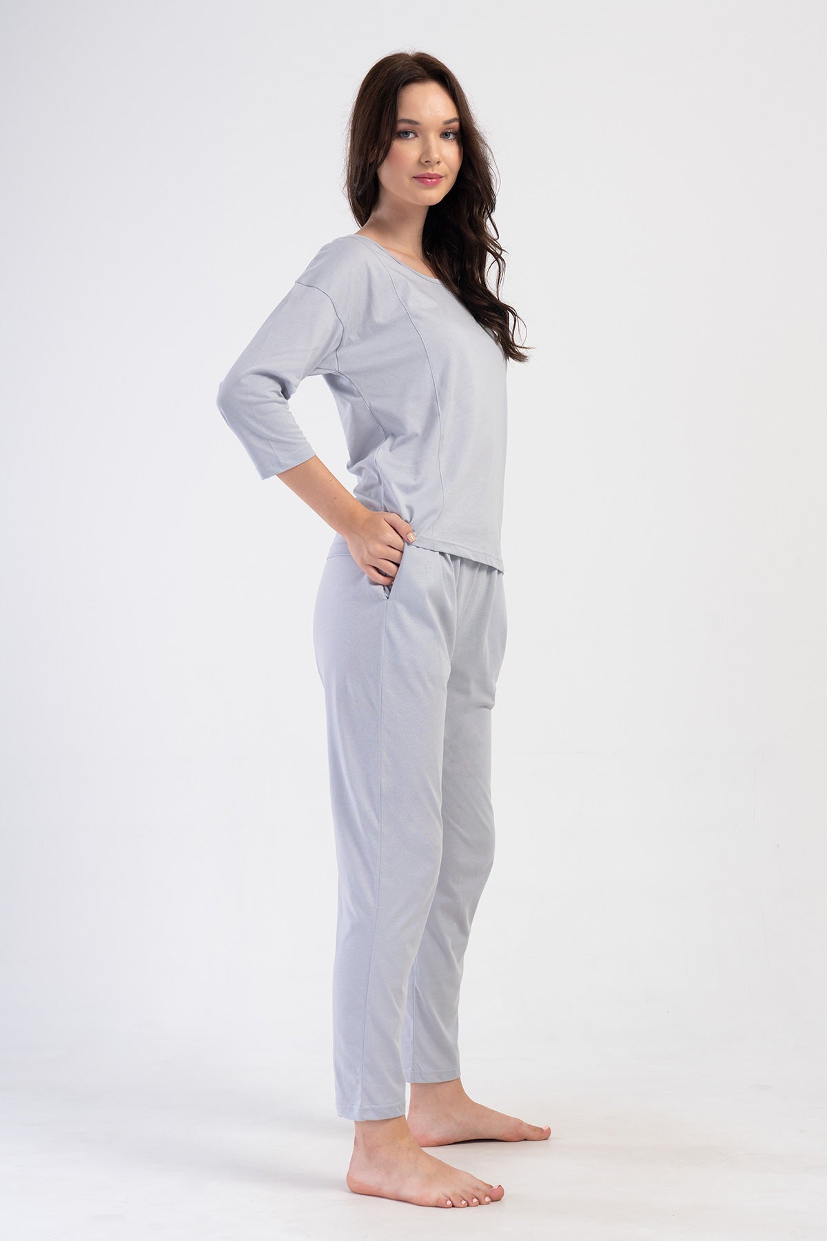 WOMEN'S P.SUPREM COLLAR, LOW-SHOULDER, 3/4-SLEEVE PLEATED PAJAMA SET WITH POCKETS