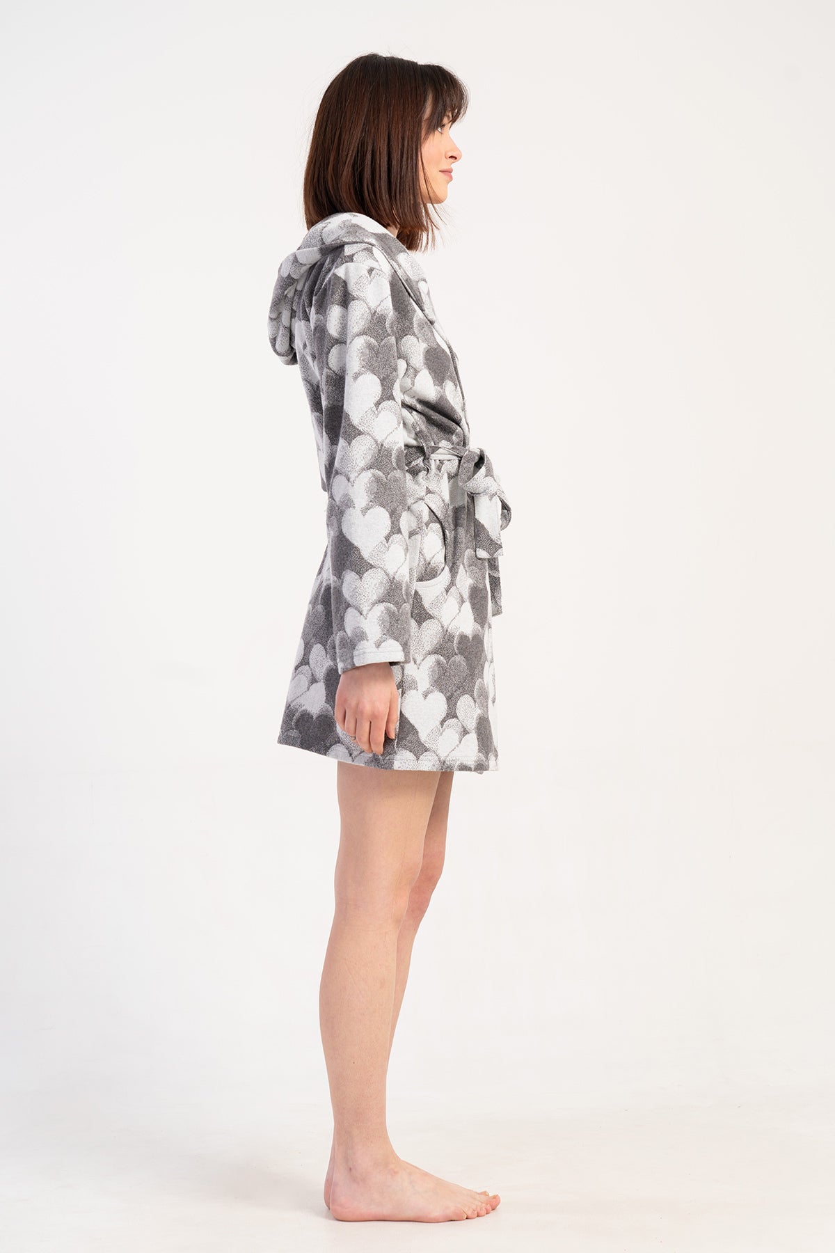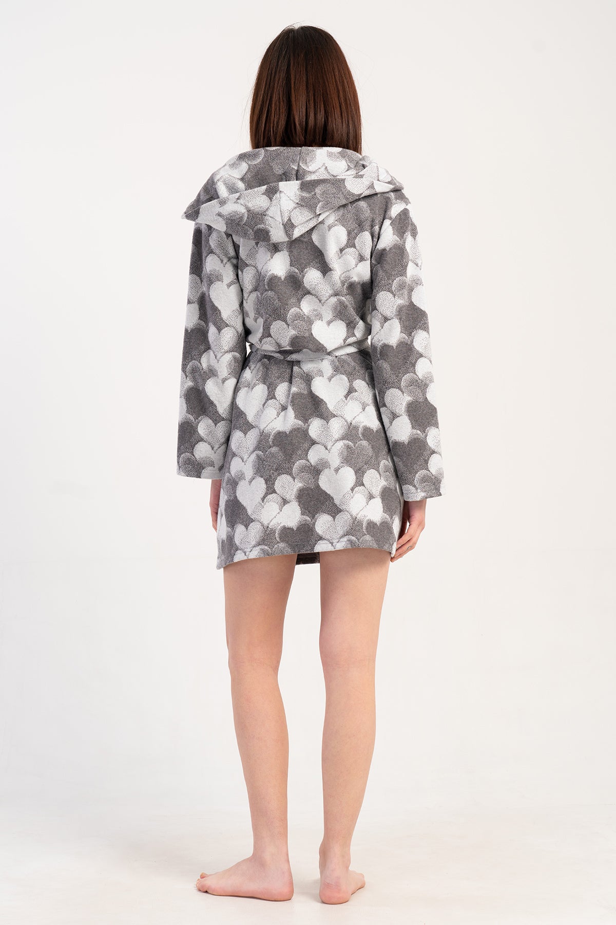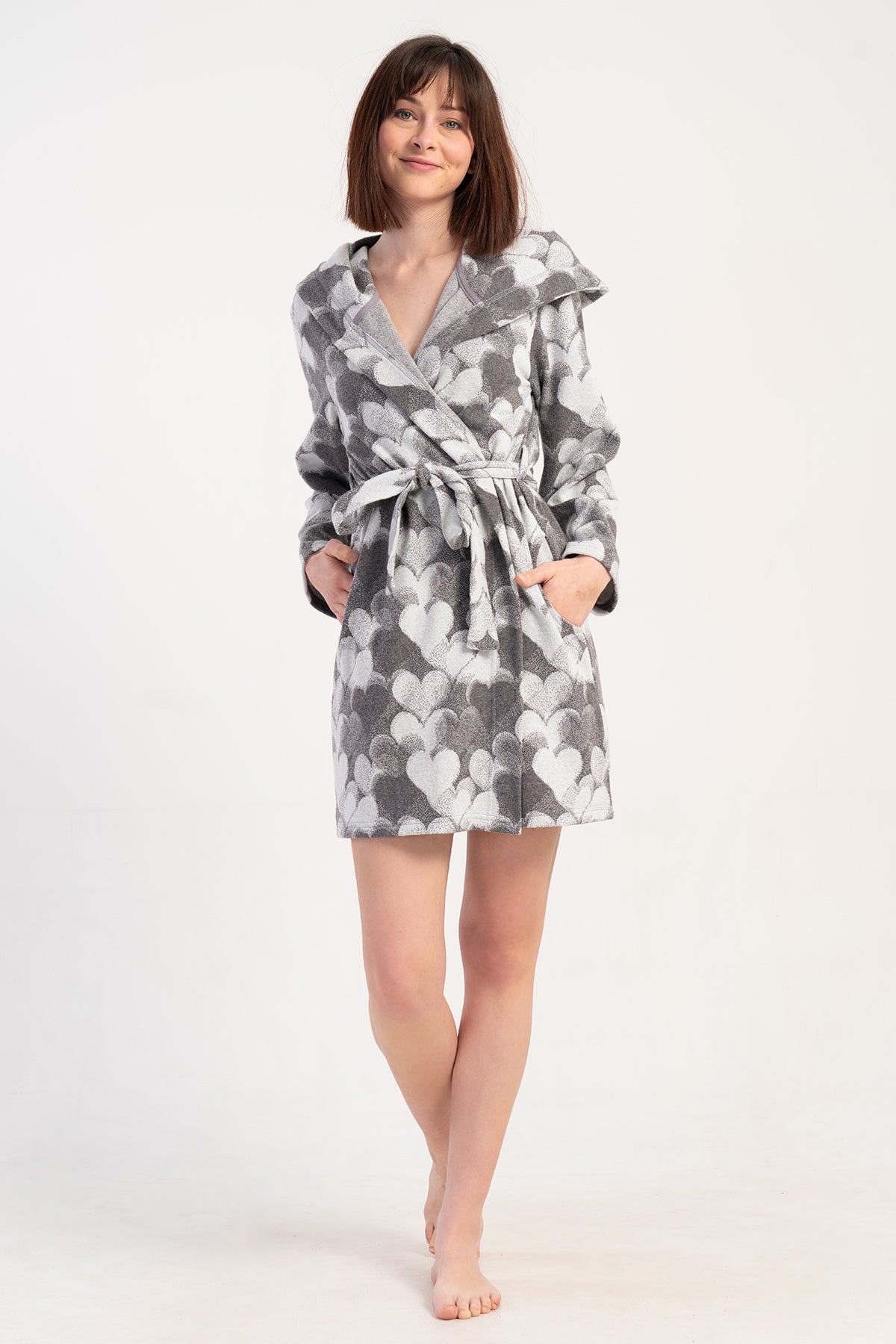 WOMEN'S JACQUARD INTERLOCK HOODED LONG-SLEEVE SHORT-POCKETED ROBE