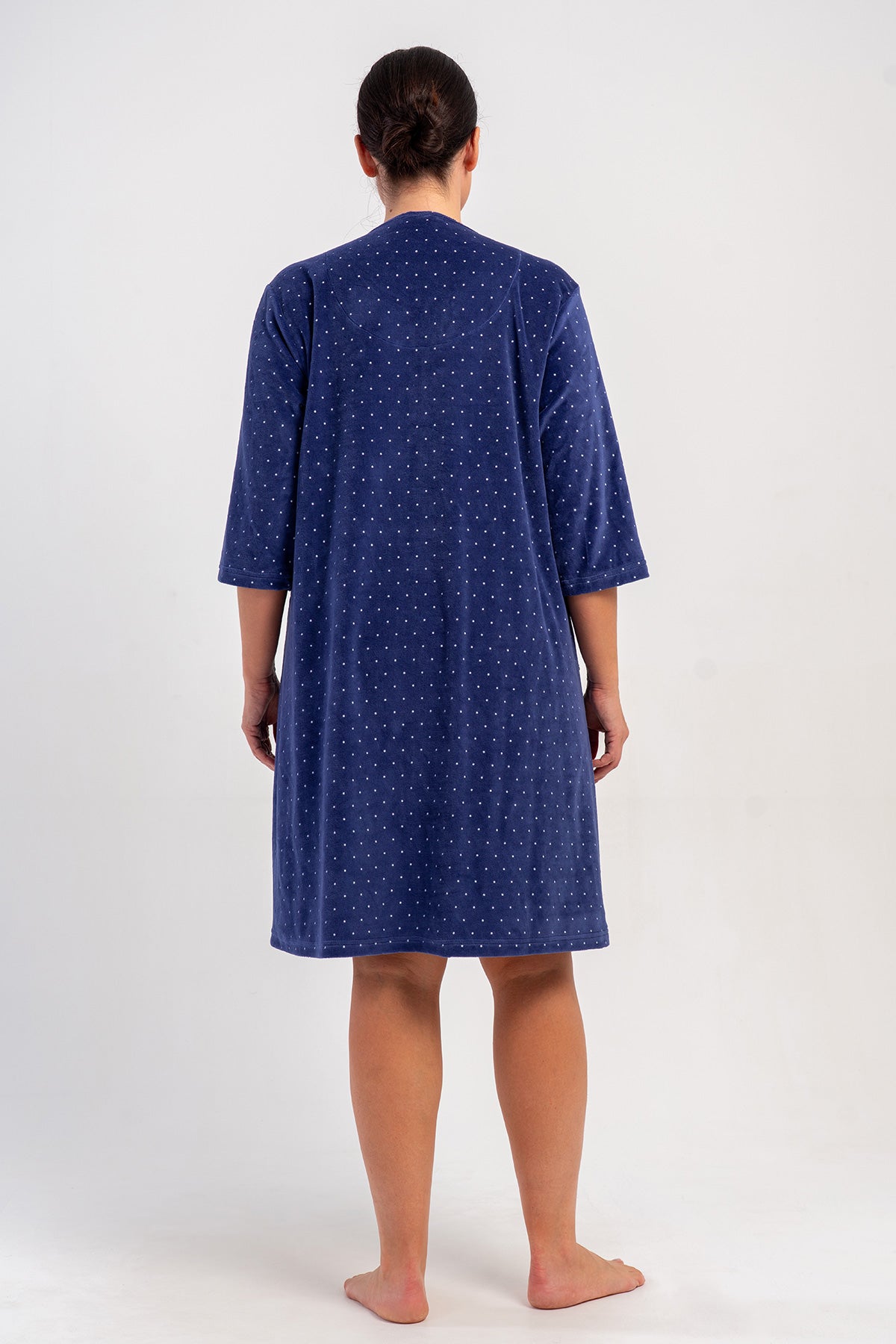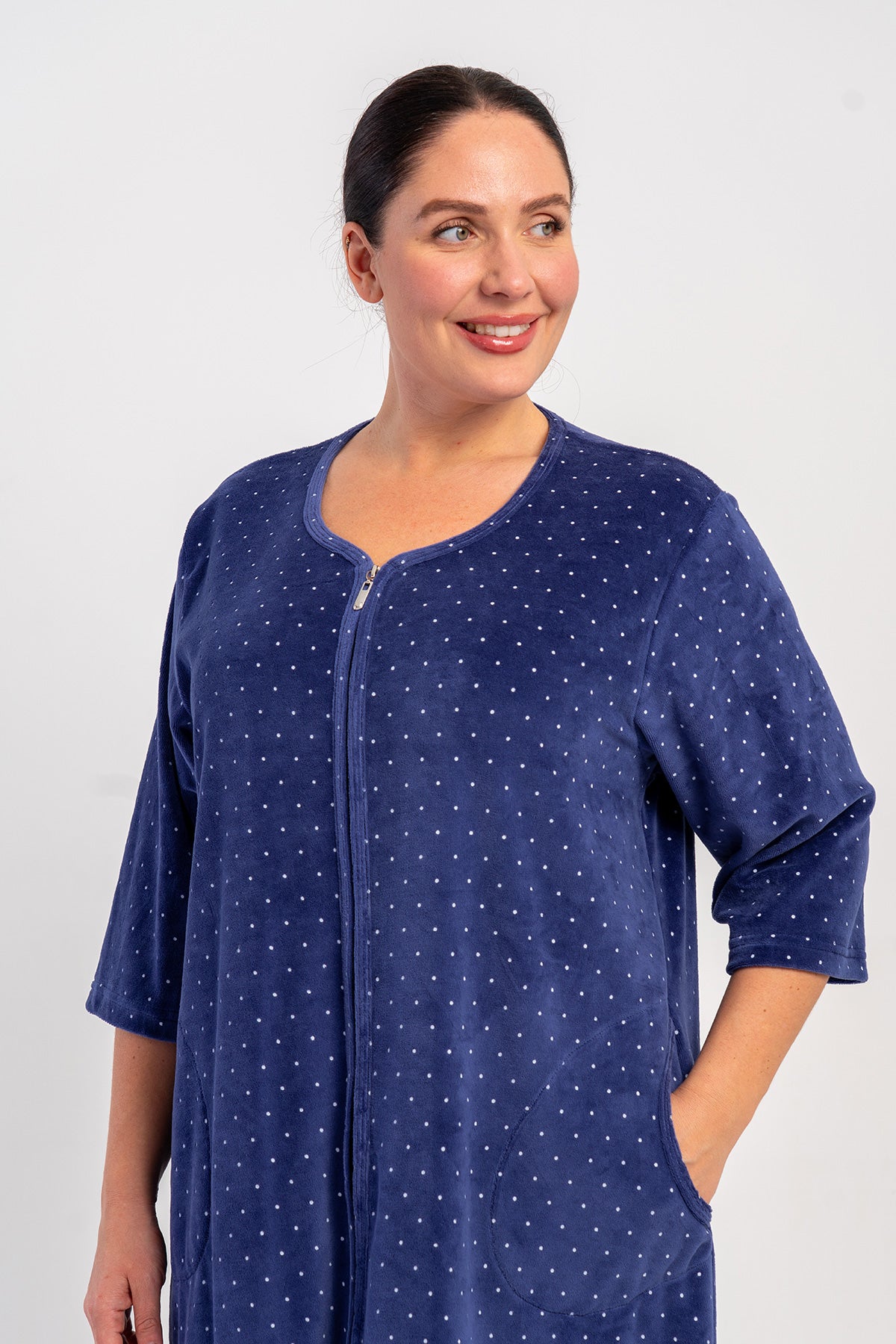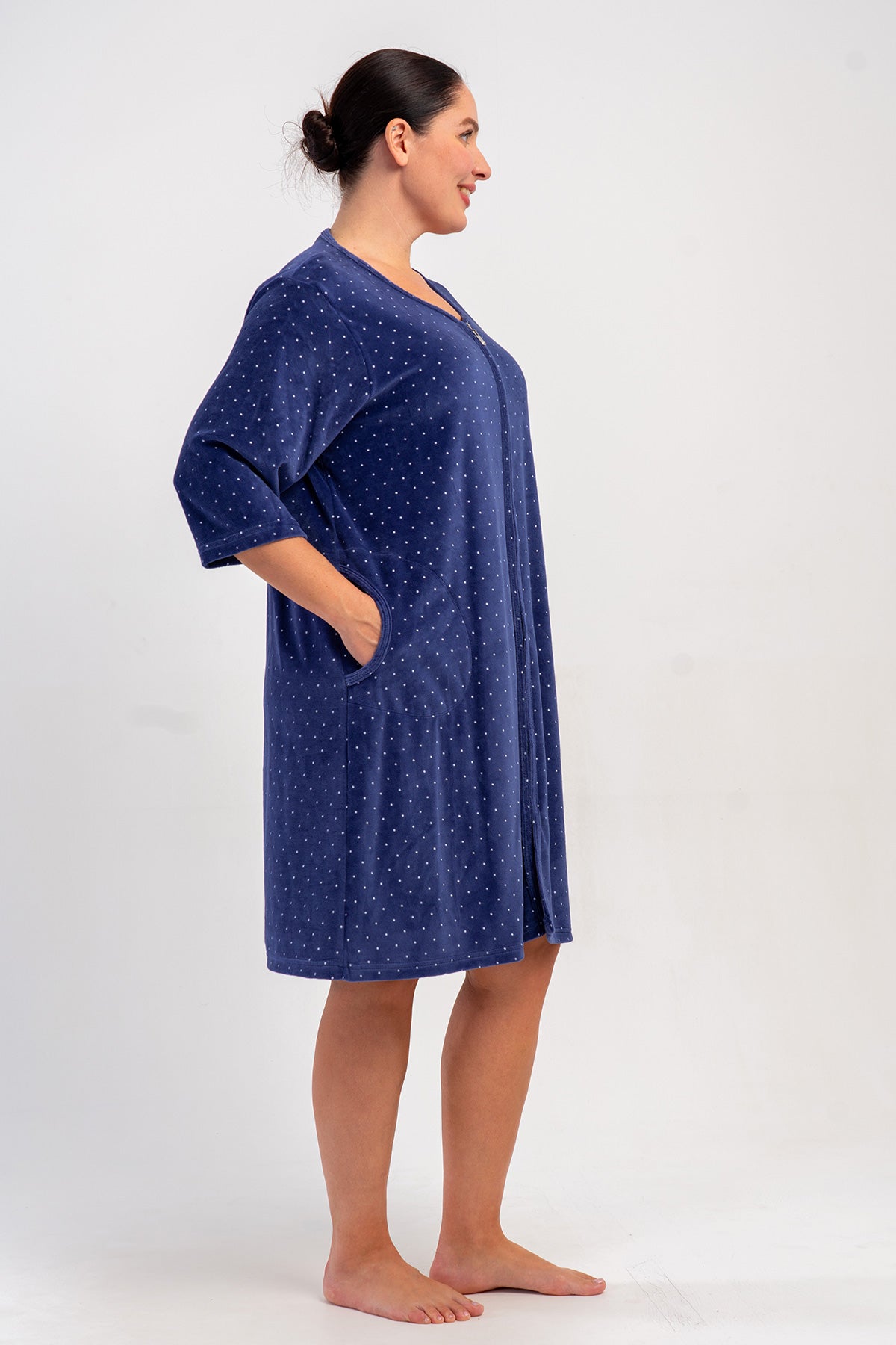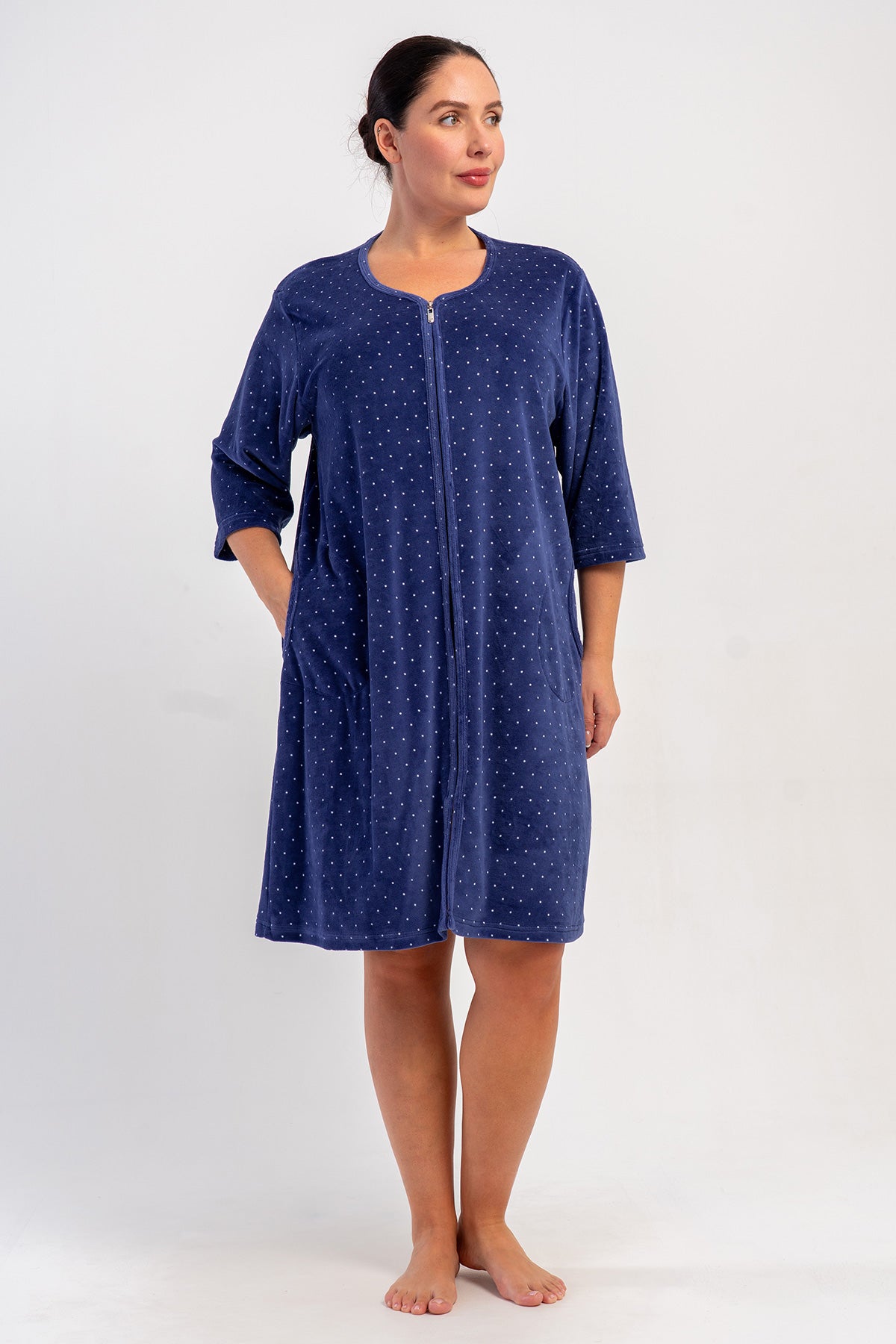 WOMEN'S COTTON VELVET XXL PLUS SIZE 3/4 SLEEVE POCKETED ZIPPERED HOME DRESS