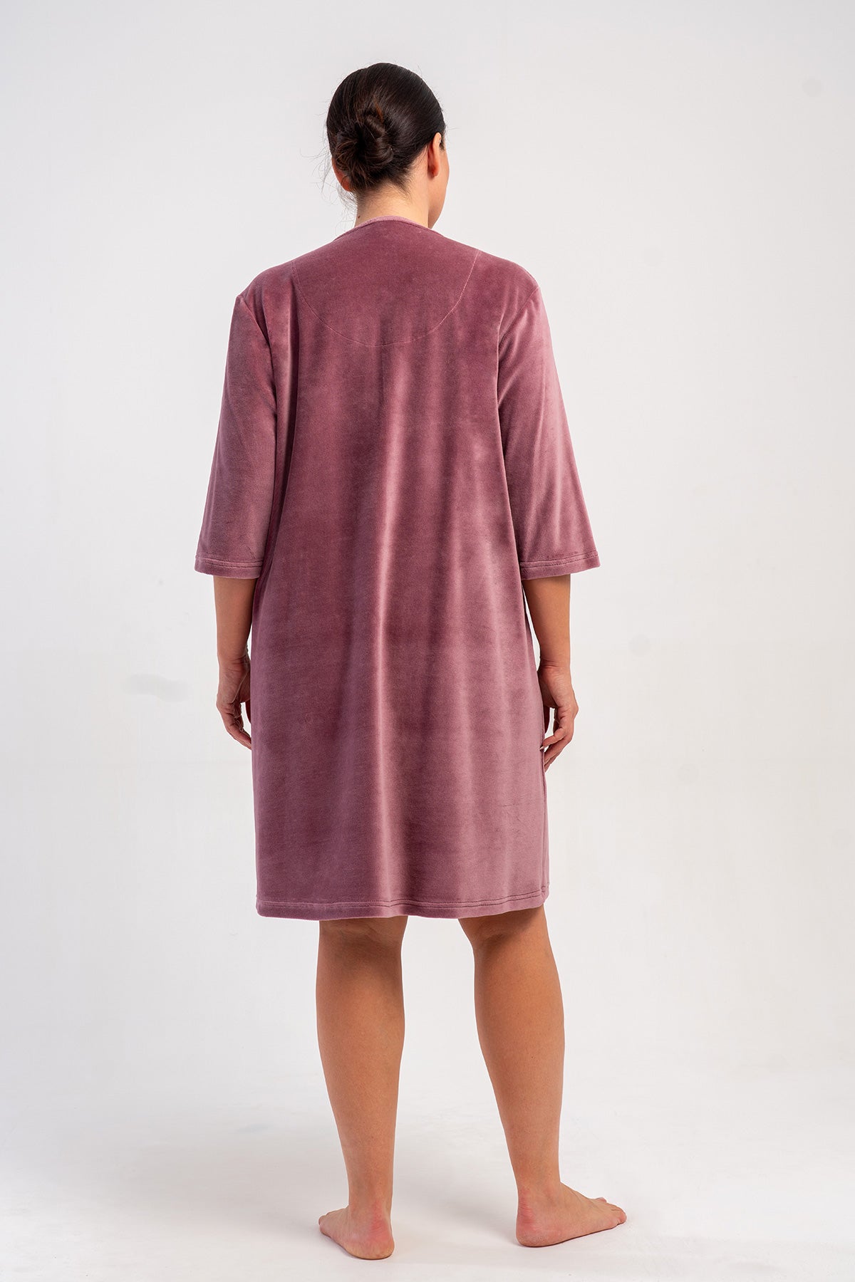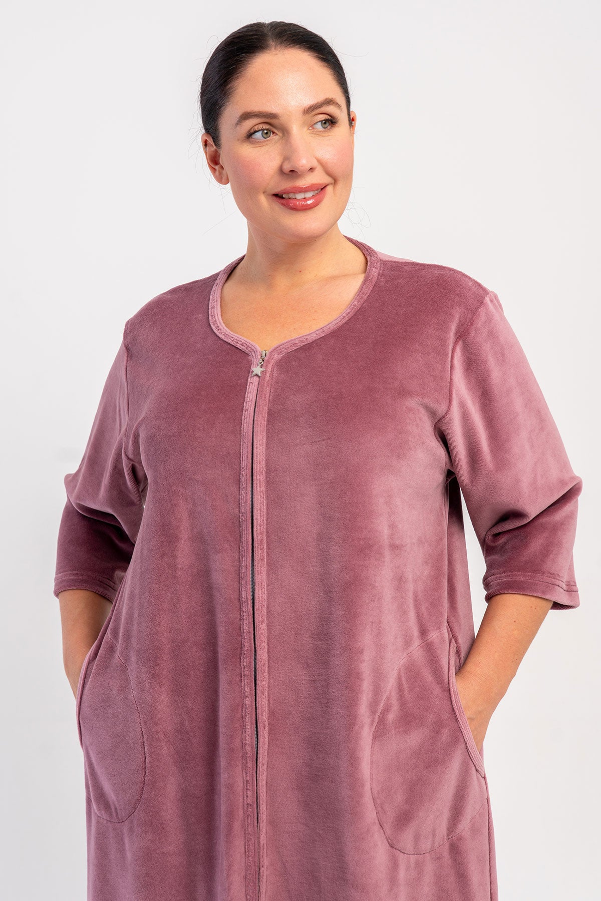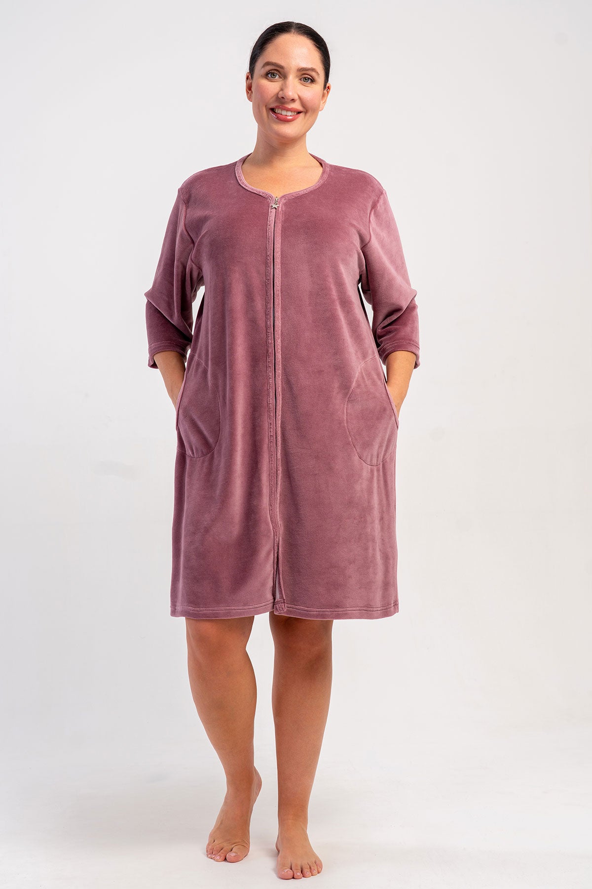 WOMEN'S COTTON VELVET XXL 3/4 SLEEVE POCKETED ZIPPERED HOME DRESS