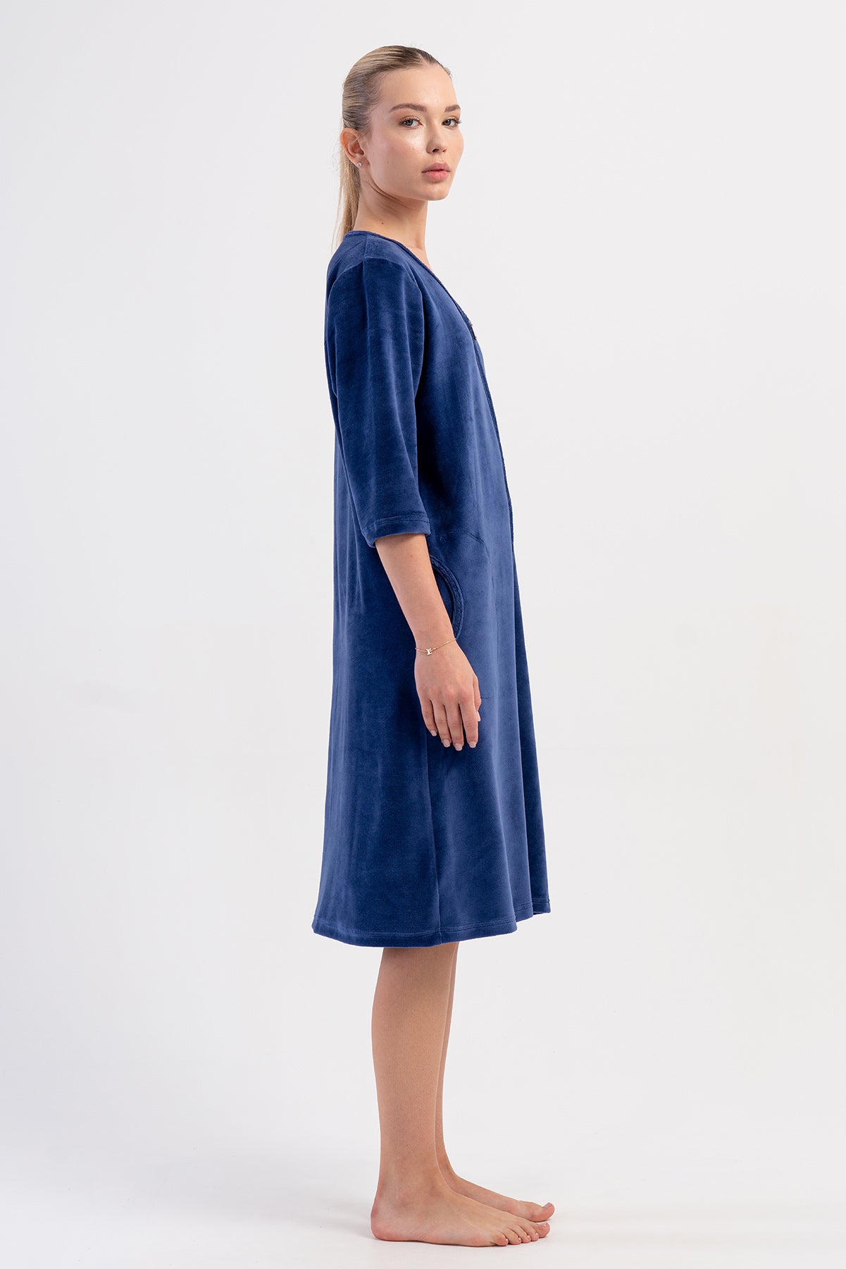 WOMEN'S COTTON VELVET 3/4 SLEEVE POCKETED ZIPPERED HOME DRESS