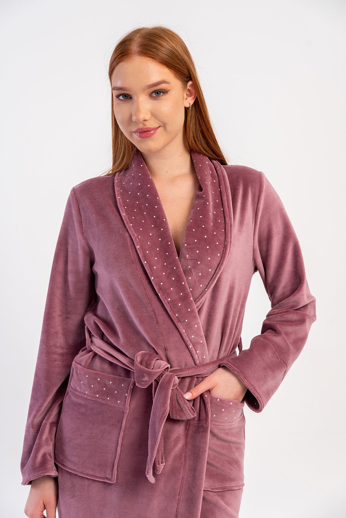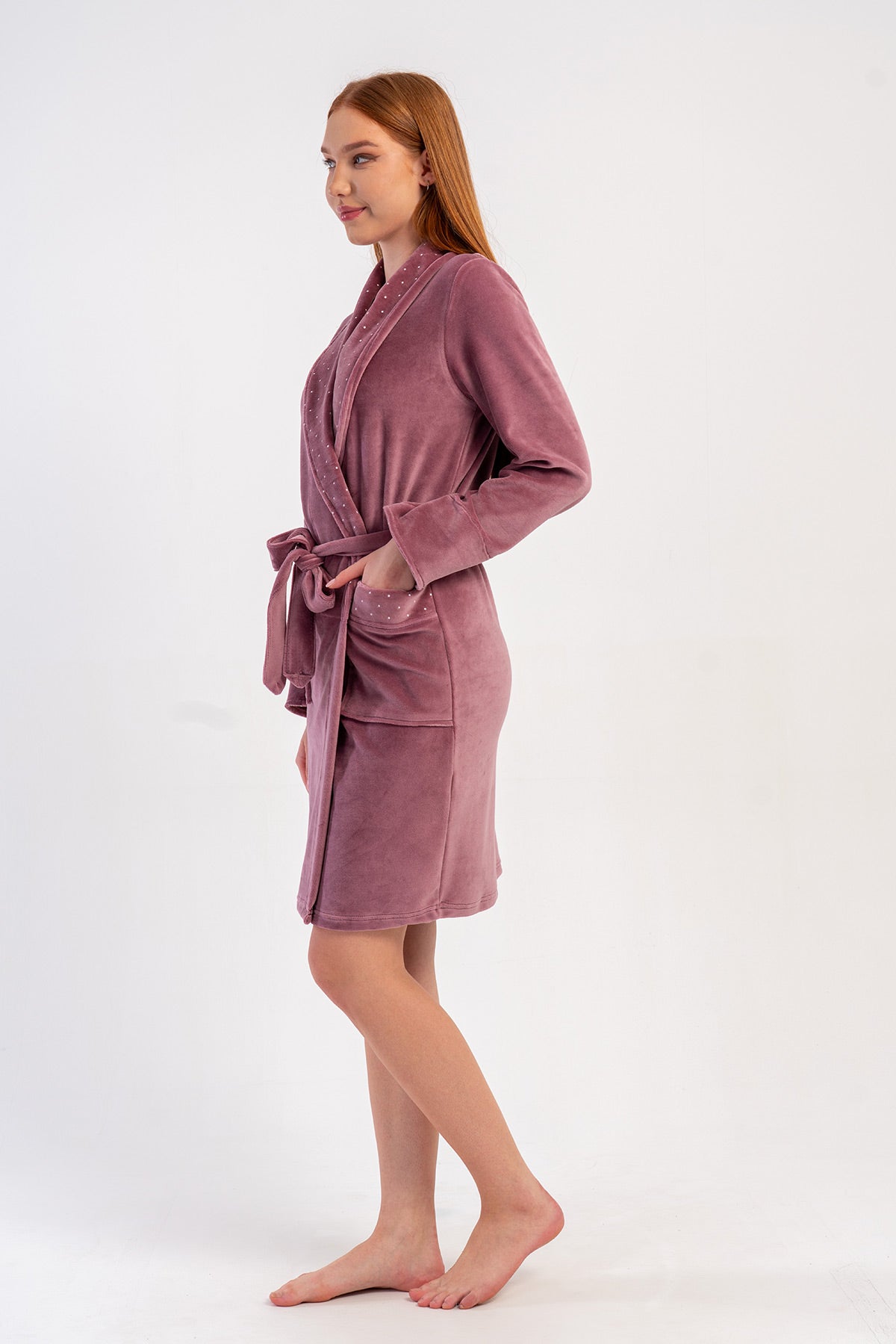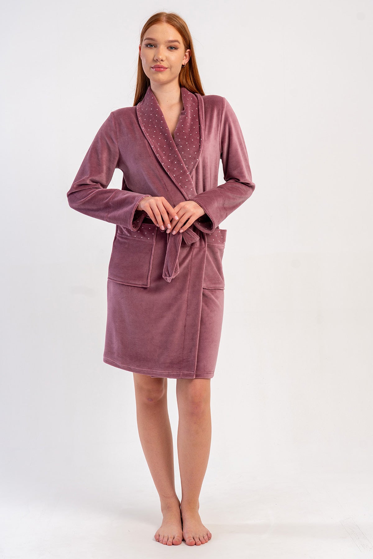 WOMEN'S COTTON VELVET LONG-SLEEVE POCKETED SHAWL ROBE