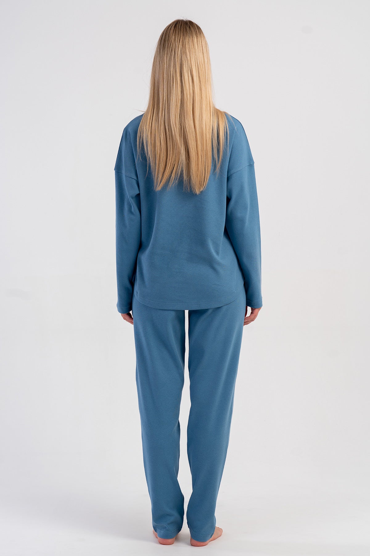 Woman Interlock Sadde Low Shoulder Long Sleeve Pyjama Set. Vienetta pajama sets combine soft fabrics and elegant prints to make your nights more peaceful. The most stylish way to unwind after a long day.