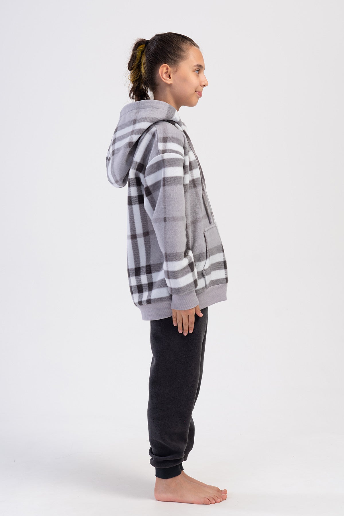 KIZ COCUK POLAR KAPSONLU DUSUK OMUZLU UZUN KOL FERMUARLI KANGURU CEPLI MANSETLI PIJAMA TAKIM(9-10/15-16)