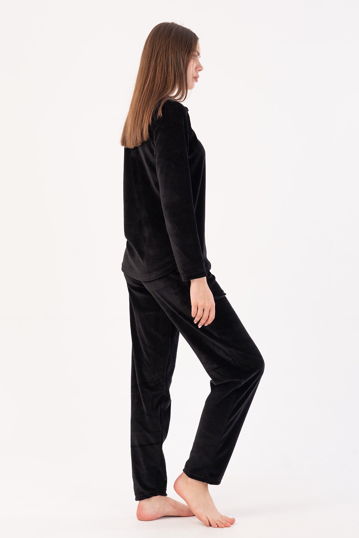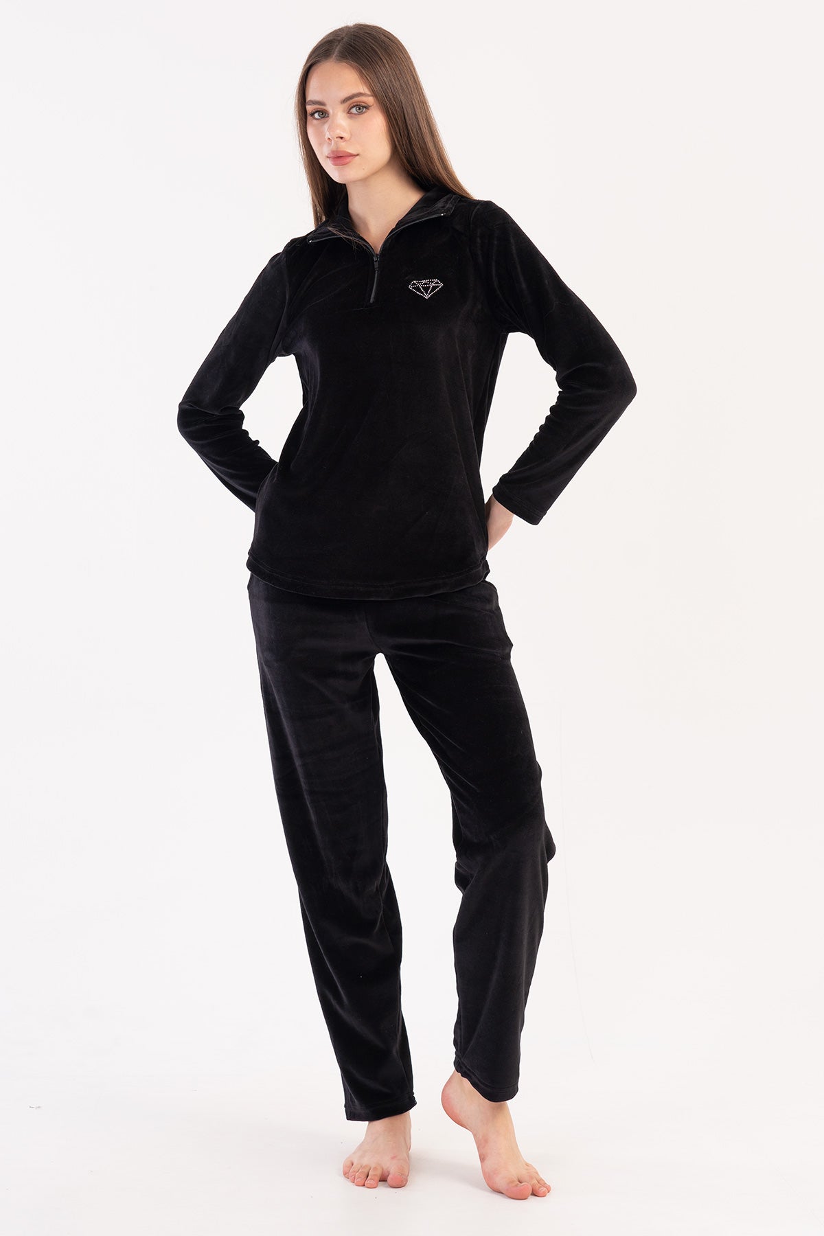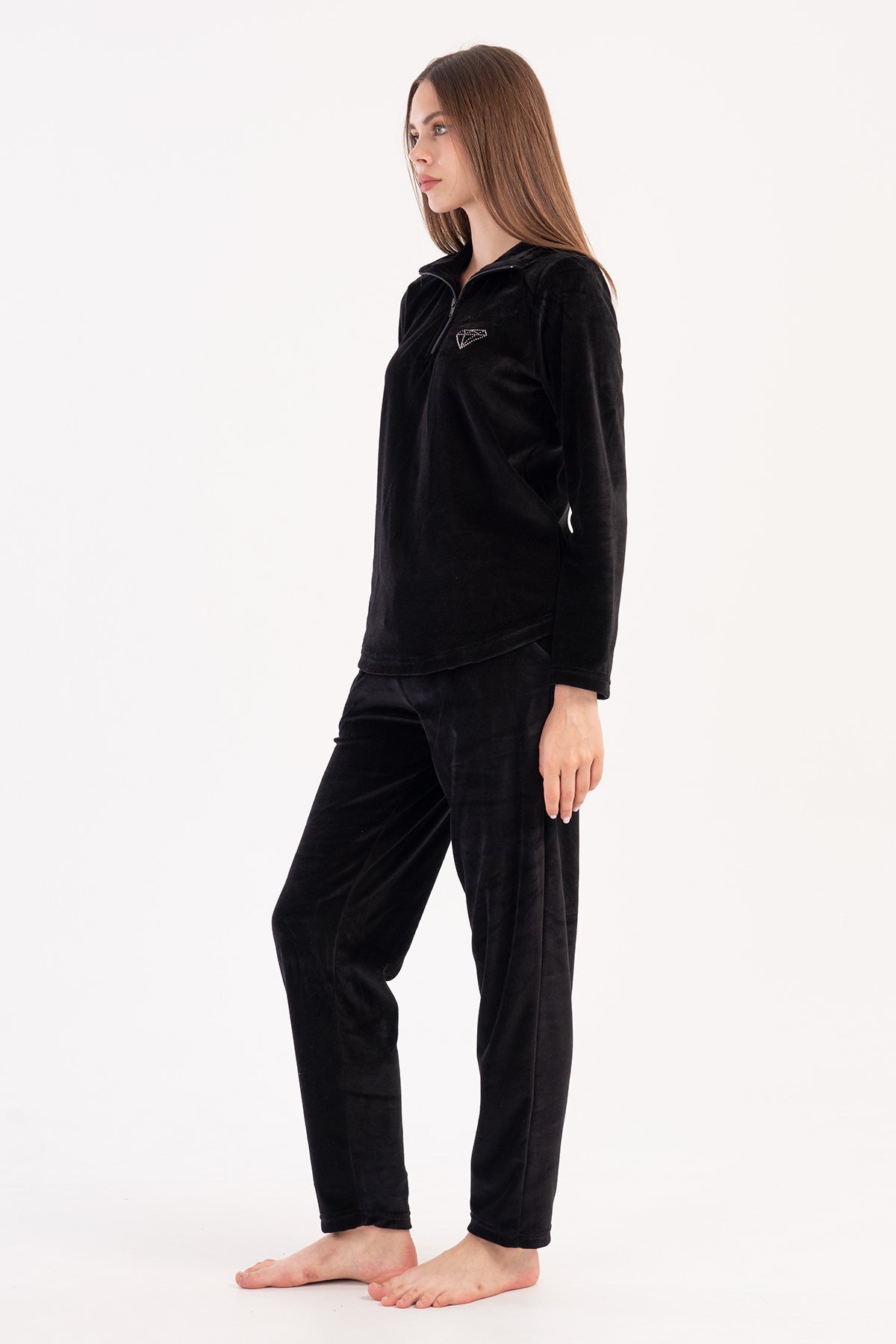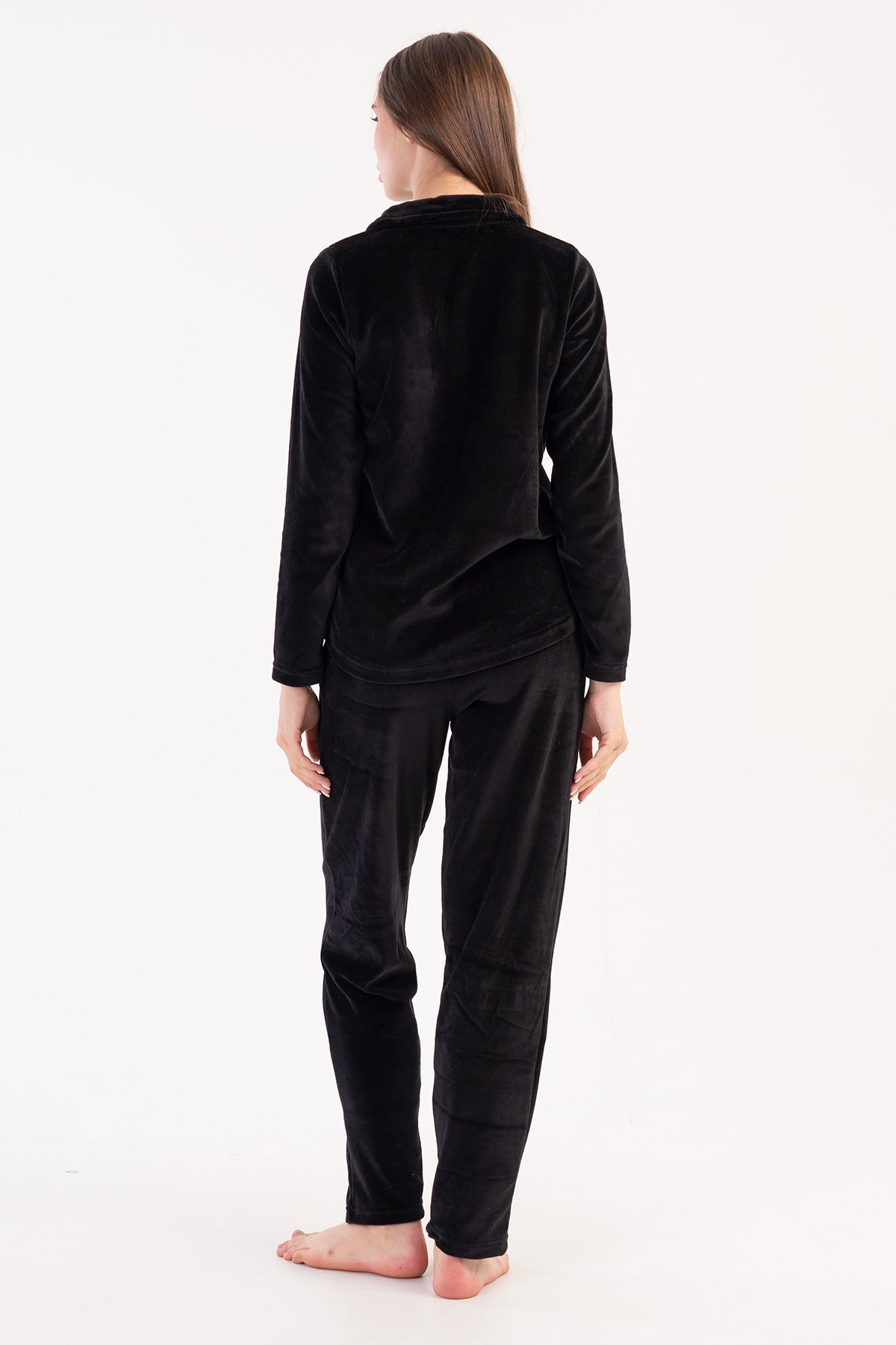 KADIN KADIFE YAKALI YARIM FERMUARLI UZUN KOL ETEGI OVAL CEPLI PIJAMA TAKIM